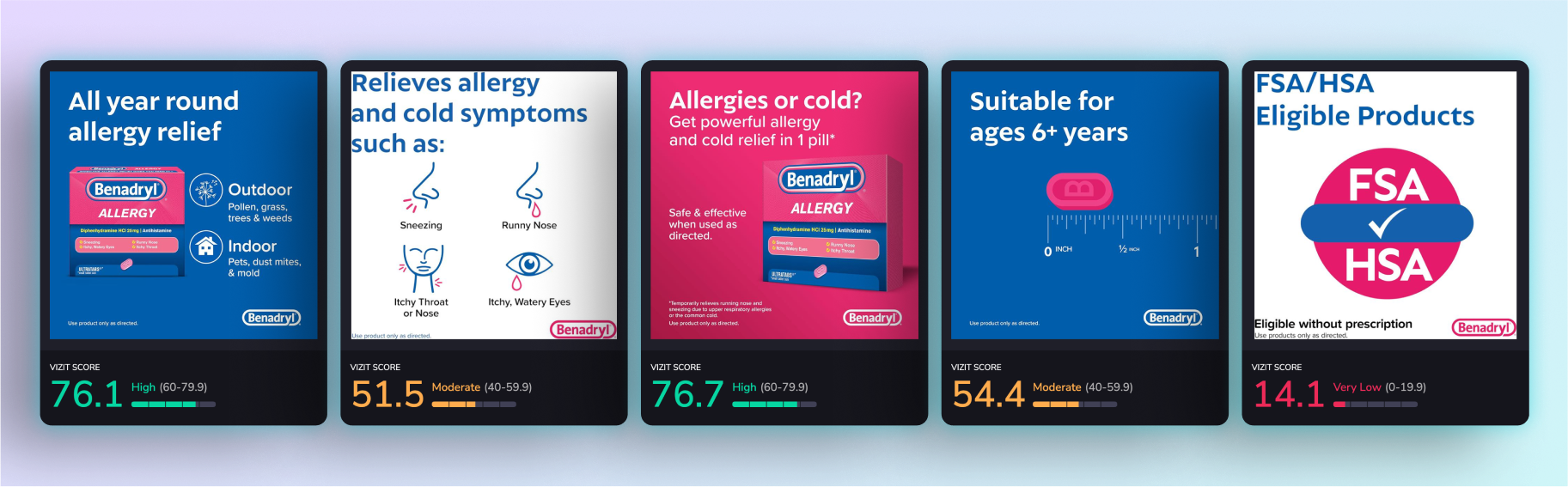 Unlike Alka-Seltzer Plus, Benadryl’s carousel relies solely on stylized infographics in the brand’s color palette, omitting lifestyle images entirely. Although most of the carousels earned moderate to high Vizit scores, one image received a notably low Vizit score of 14.1.