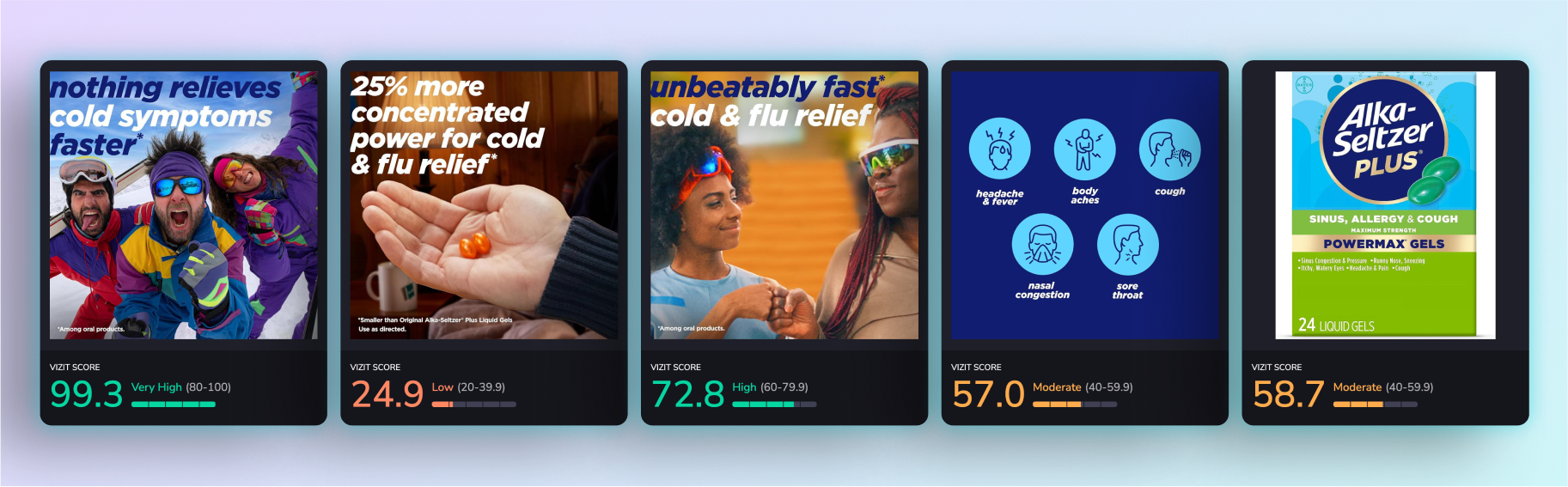 Additionally, Alka-Seltzer Plus’ infographic and product packaging carousel imagery received only moderate Vizit scores, indicating there’s room for improvement.