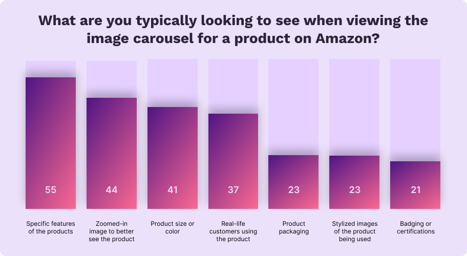 According to the survey from Vizit and the Path to Purchase Institute, over one-third of Amazon shoppers look for real-life images of the product being used during the purchasing journey. They want to see specific features of the product or close ups to get a better understanding of what they’d be purchasing. Seeing those features touted by verified purchasers, influencers, and peers can persuade them to buy.