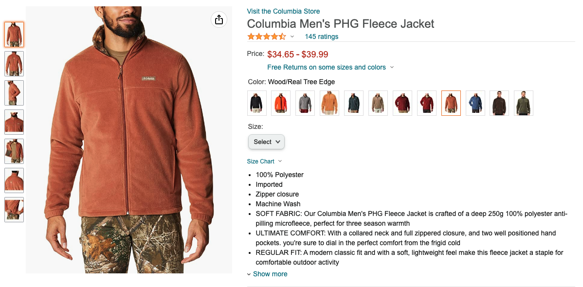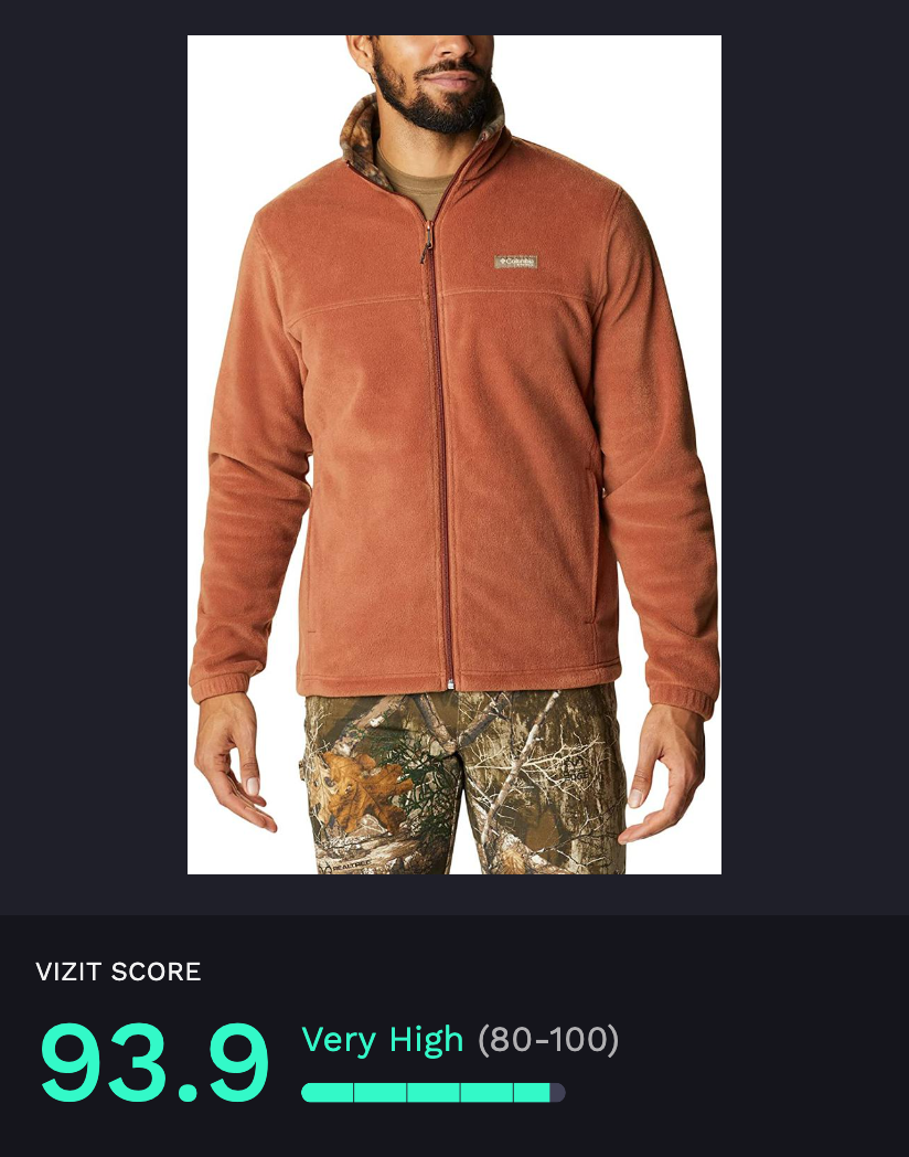Vizit’s recent Apparel Visual Brand Performance Report included a section dissecting the image trends of men’s fleece jackets. A prime example of a high-scoring product detail page (PDP) in this category is the Columbia Men’s PHG Fleece Jacket on Amazon.