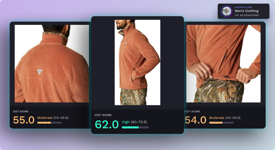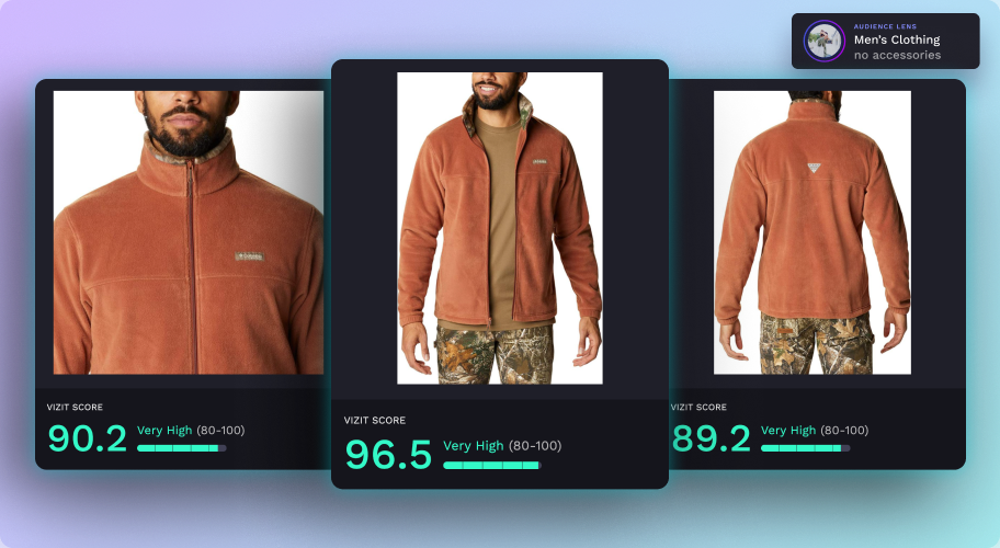 The PHG Fleece Jacket hero image earned a Vizit score of 93.9, firmly placing it in the top 10 highest scoring hero images in the category when using a Men’s Clothing Audience Lens.