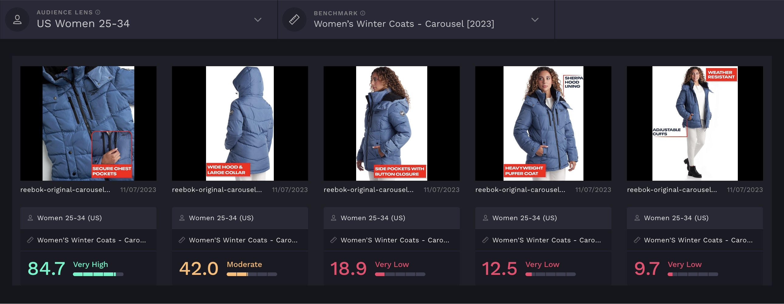 The carousel benchmark of women's winter coats reveals various trends within the category. Stylized infographics featuring closeups of the jackets accompanied by text and symbols to highlight jacket features resonated well with the women 25-34 demographic. Notably, there was a strong emphasis on visualizing the jacket's technology, particularly its warmth. Another category trend was visuals combining several images into a collage, with minimal text at the bottom or sides of the image.