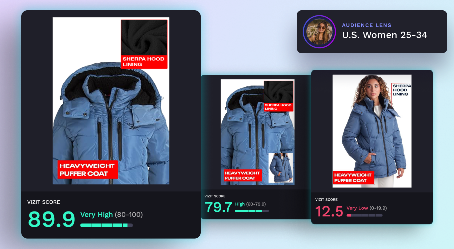 We decided to provide creative updates to carousel imagery on the Reebok Women Winter Jacket PDP. Take a look at how we revamped Reebok’s carousel to increase Vizit Scores™ for the women ages 25-34 audience.