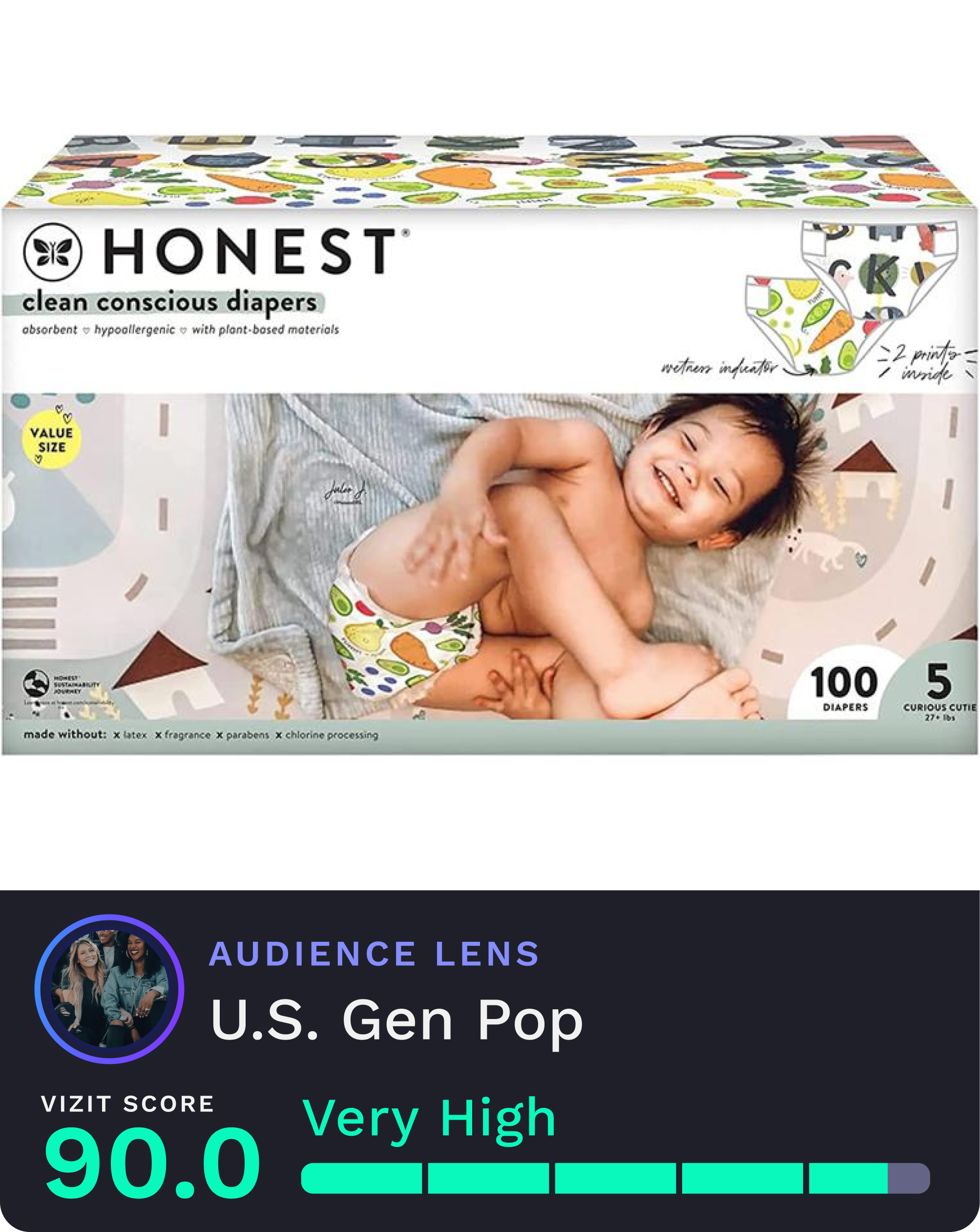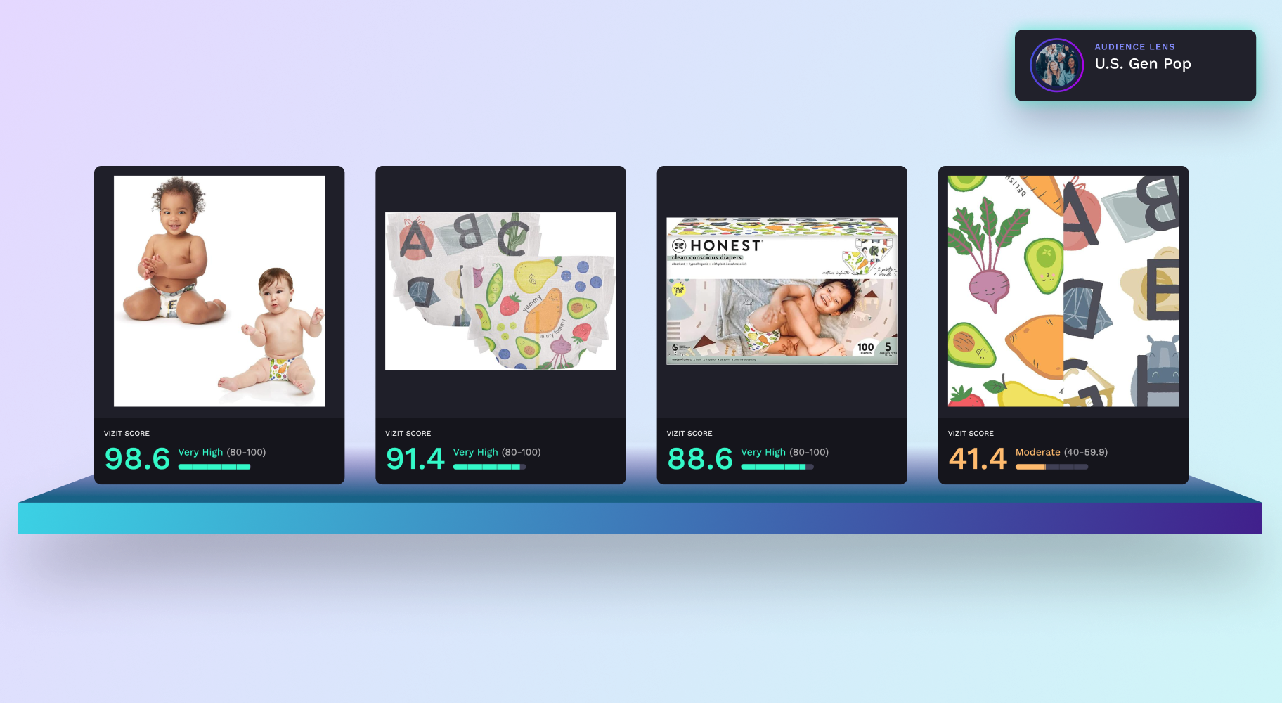 Two of The Honest Company’s highest scoring carousel images were images that showcased the d diapers out of the box. This included visuals of happy babies wearing them and the actual diaper with its fun designs visible. However, while the audience found the designs appealing, they did not feel the same about the close-ups of the design: According to the Vizit analysis, that visual earned much lower scoring 41.4.