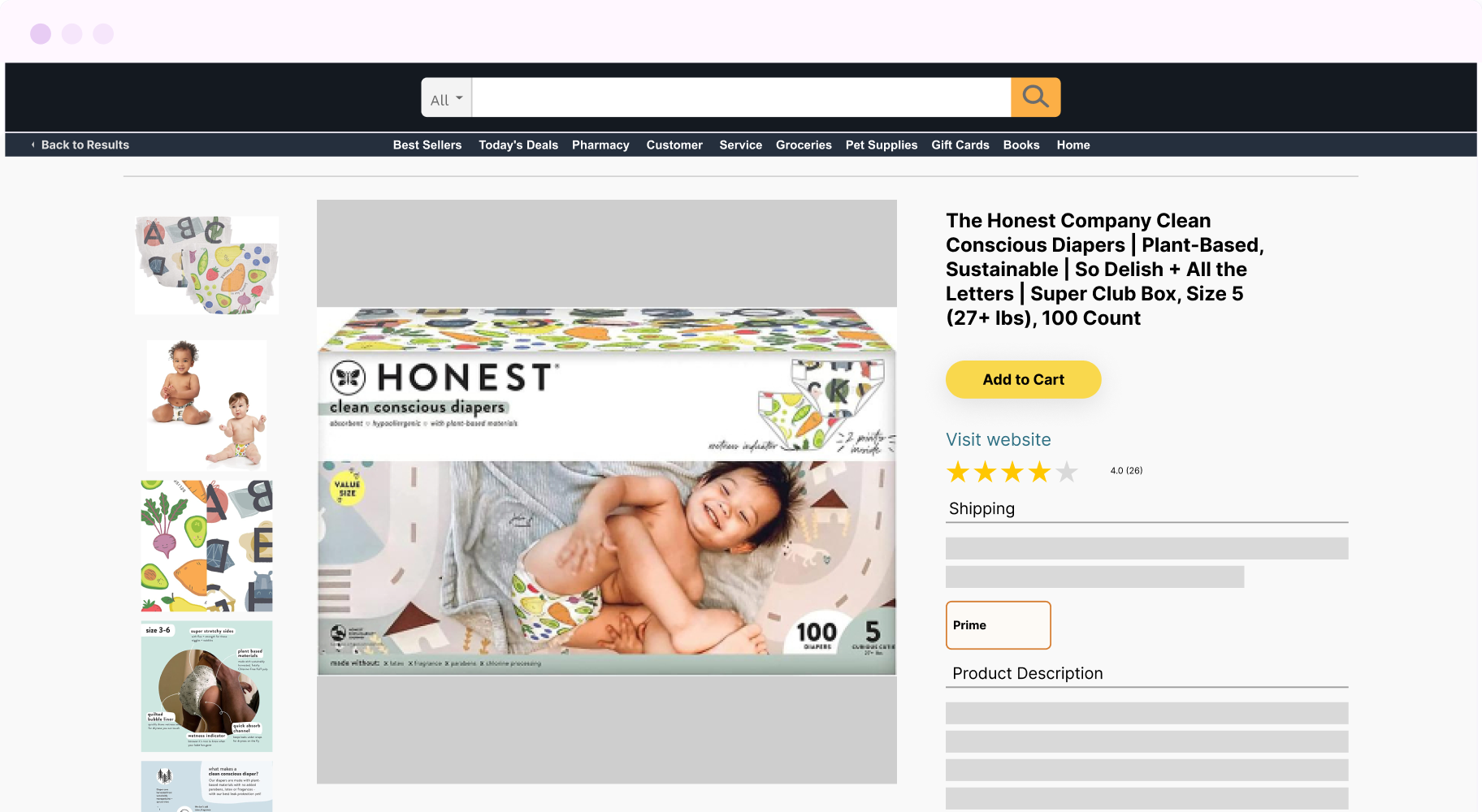 As part of Vizit’s Brand Attention Index, we recently looked at some of the standout brands and images among disposable diaper listings on Amazon. There were a few high-performing brands, so let’s look at how The Honest Company’s Clean Conscious Diapers dominated the competition on Amazon’s digital shelf.