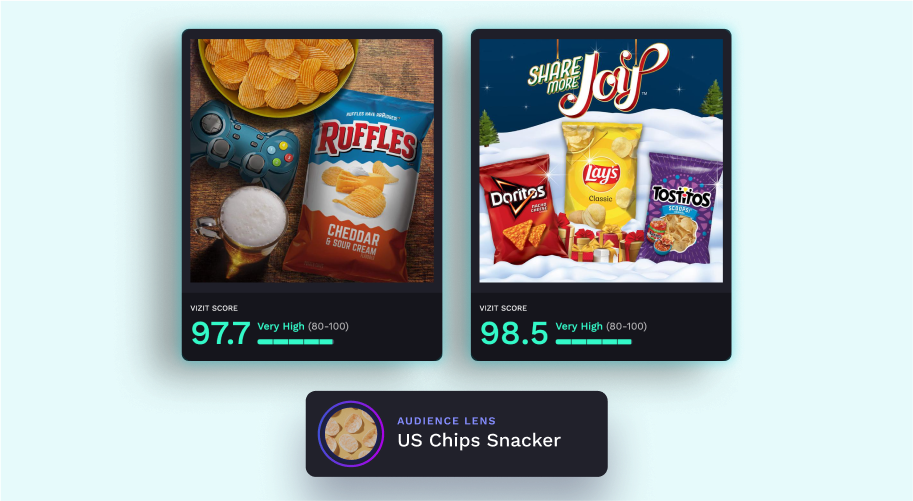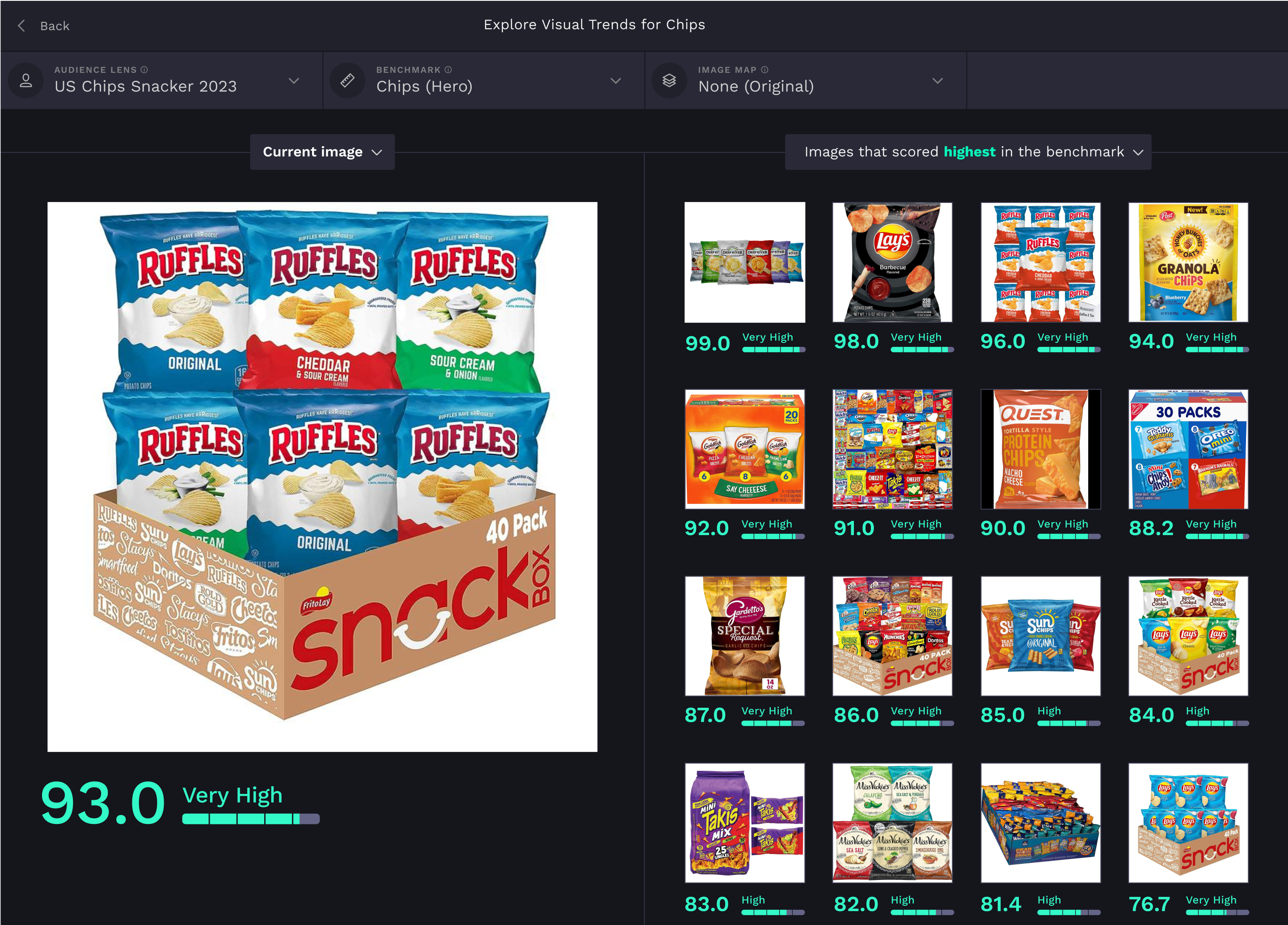 The Ruffles variety pack hero image earned a Vizit score of 93.0, firmly placing it in the category's top 10 highest scoring hero images when using a U.S. Chips Snacker Audience Lens.