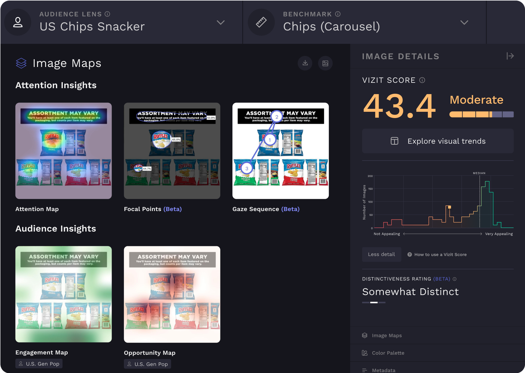 Ruffles’ lowest scoring carousel images do not follow the trends that its higher-scoring counterparts do. For example, instead of using a stylized background, the first image uses a plain white background. Additionally, the opportunity maps demonstrate that showing the back of the chips bag with the nutrition labellowers visual engagement. Modifying the image by changing the background and not displaying the back of the bag could significantly increase the Vizit score, while maintaining the main message of the carousel.