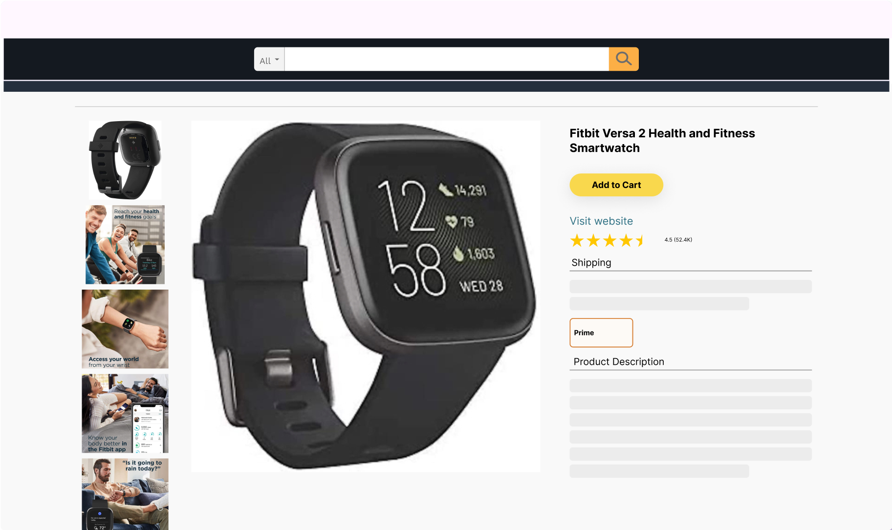 Vizit’s recent Consumer Electronics Visual Brand Performance reports included a section dissecting the visual trends of fitness trackers on Amazon. A prime example of a high-scoring product detail page (PDP) in this category is the Fitbit Versa 2 Smartwatch.