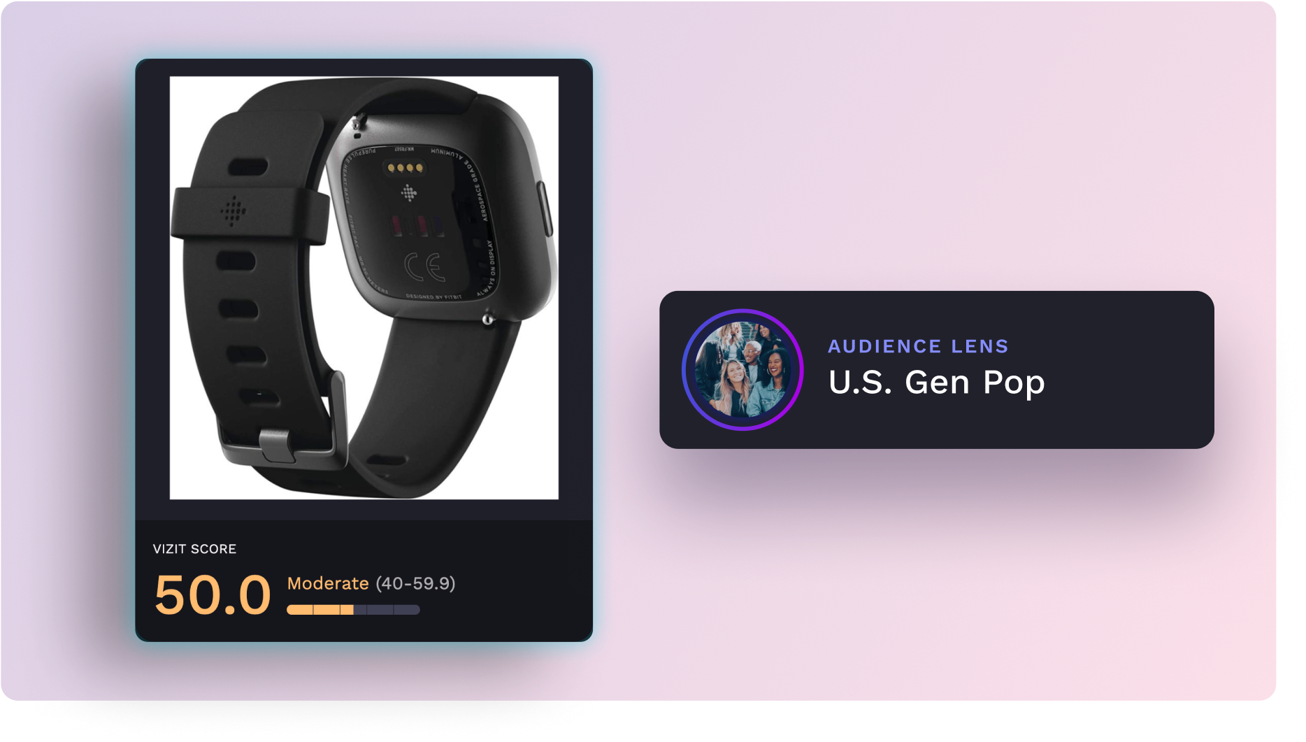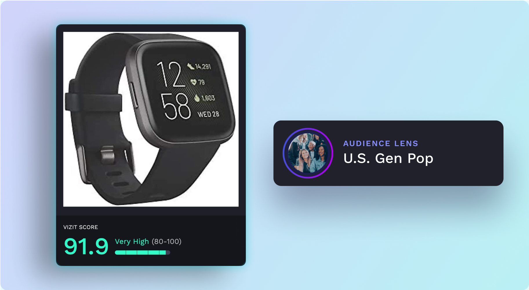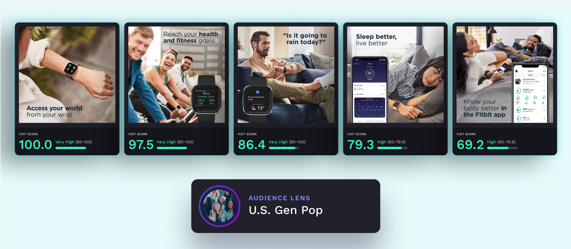 The Fitbit Versa 2 hero image achieved one of the top scores in its category using a U.S. Gen Pop audience lens. It received an impressive Vizit score of 91.9.