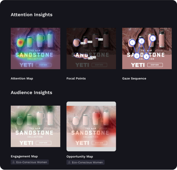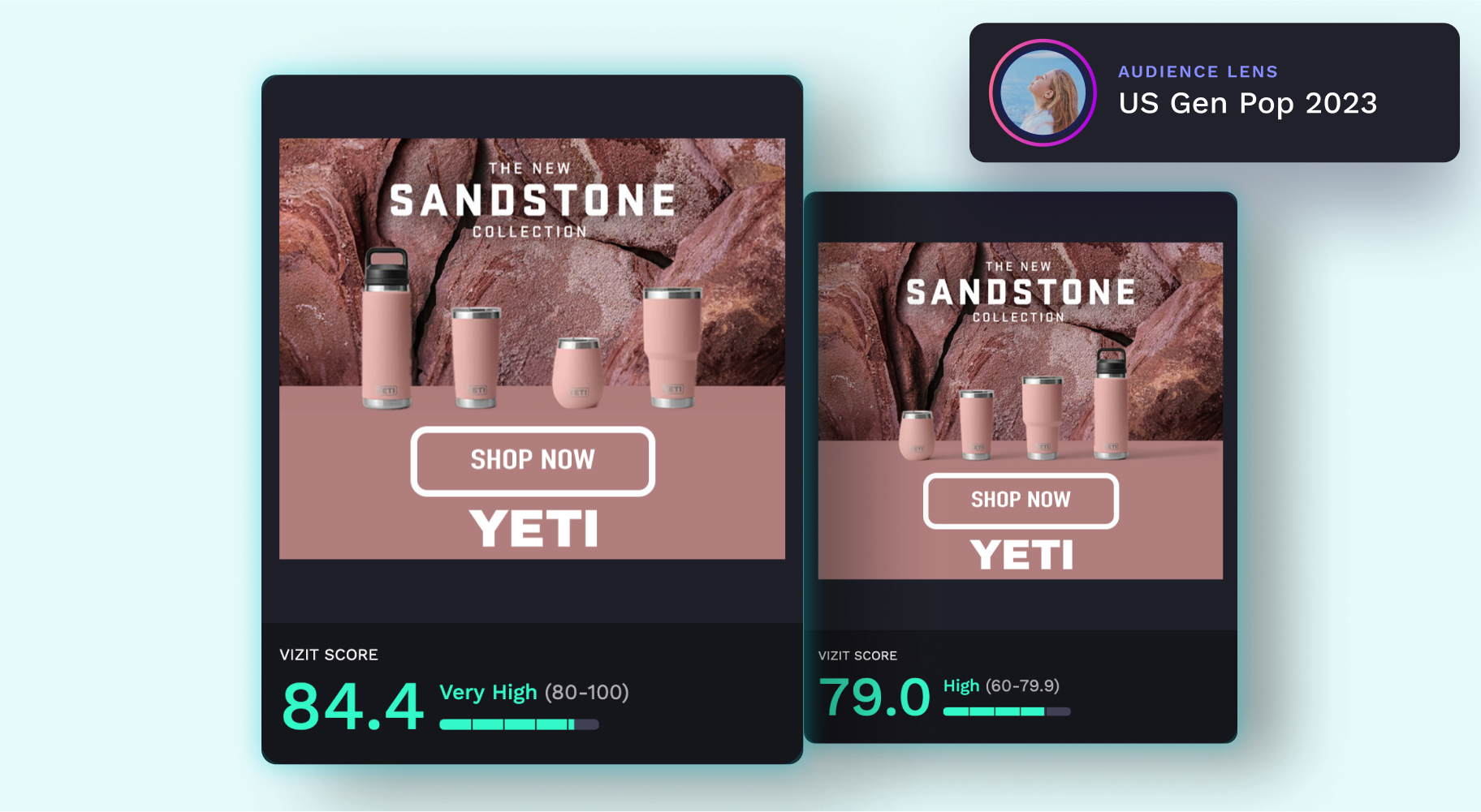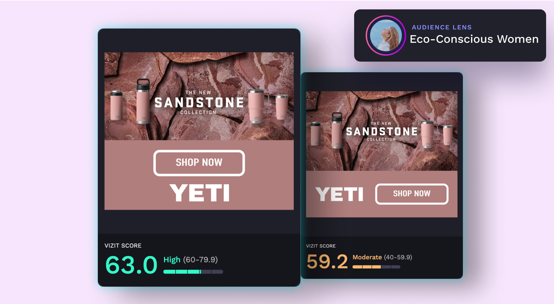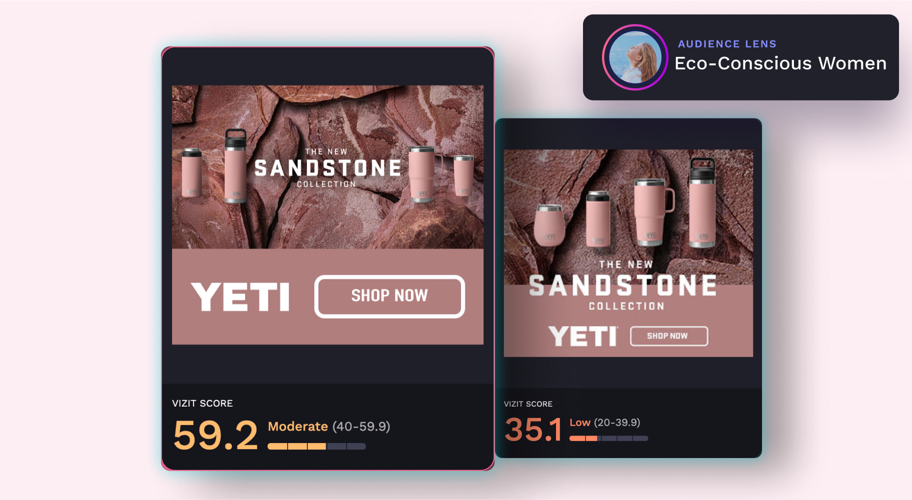 After running one of Yeti’s digital ads through Vizit Content Studio, we discovered the ad imagery was not effectively capturing the attention of the target audience, scoring a low 35.1 Vizit score with the Eco-Conscious Women Audience Lens. So, we decided to provide some creative updates. Take a look to see how 20 minutes of edits increased the Vizit score from 35.1 to 84.4.