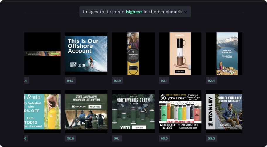 In Vizit's image analysis, we noticed that the left side of the image stands out positively, but the right side affects the overall score negatively. When we looked at benchmarks for insulated water bottles, it became clear that placing text in the center or at the top resonated well with the Eco-Conscious Women audience.
