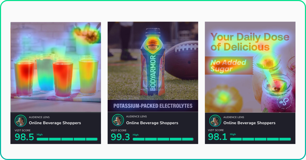 Vizit uses audience-specific AI models trained on trillions of visual interactions to generate positive and negative appeal maps. These models simulate how different shopper segments respond to color, composition, subject matter, and other visual elements.