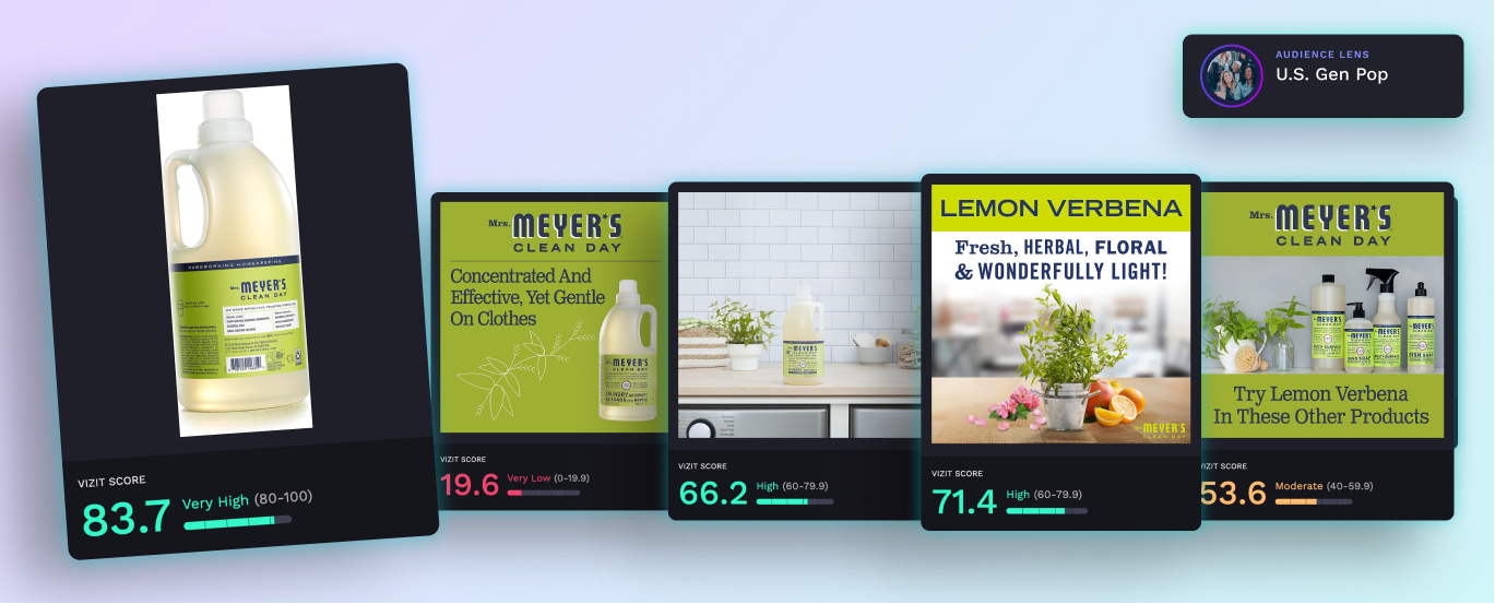 A key point to notice is the use of text in the images, as copy-heavy visuals from Mrs. Meyer’s tended to score lower. One image in particular is significantly Optimizing visuals by cutting down on words and showing the message instead of telling would benefit the brand.