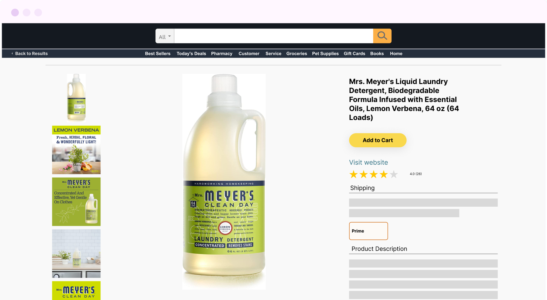 Mrs. Meyer’s stays on top of the category trends in its image carousel. For example, this section features imagery conveying the scent of the detergent and pictures of the product in use in a laundry room. Both of these are impactful—and high scoring—strategies used by brands in the laundry detergent space.