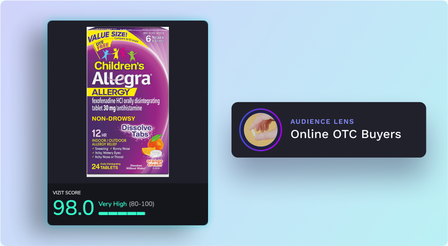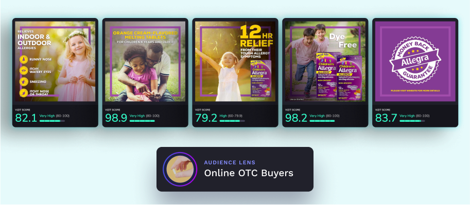 The Allegra allergy medicine hero image earned a Vizit score of 98.0, placing it as the category's second highest-scoring hero image when using an Online OTC Buyers Audience Lens.