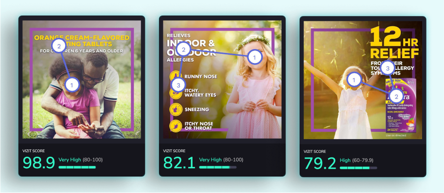 The remaining carousel images garnered high Vizit scores. These visuals resonated well with Online OTC buyers, adhering to category best practices such as featuring models being active outdoors and positioning copy near the top of the image. Vizit’s gaze sequence maps indicated a strong likelihood of audiences noticing and engaging with descriptive text in this placement.