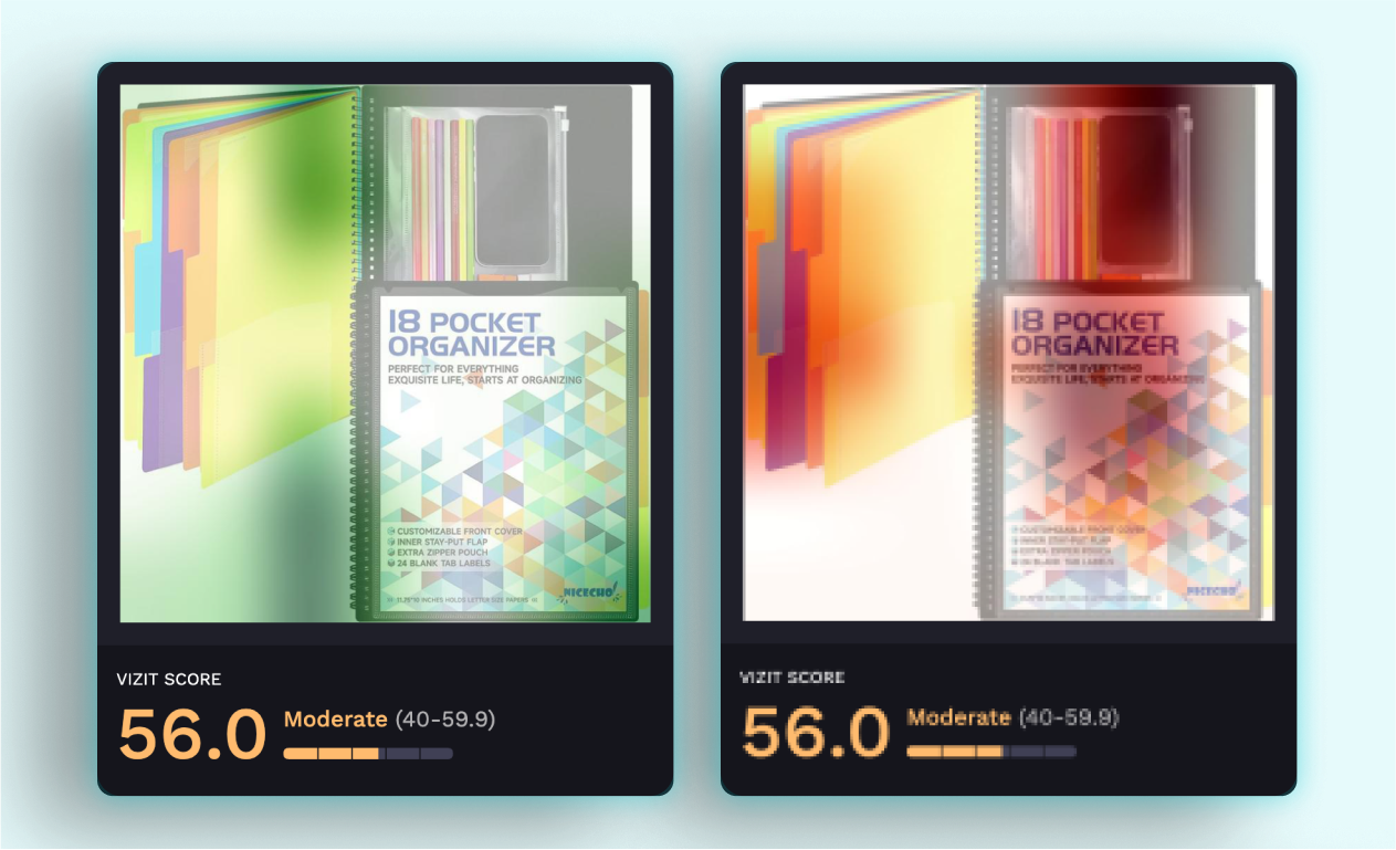 Nicecho’s carousel images have an average score of 48.5. Its highest scoring image follows best practices for the category, displaying the pocket folder in use in a group setting. However, its lowest scoring images accentuate the retail front cover, which presents challenges due to excessive hard-to-read text. Eliminating the focus on this cover could significantly enhance the overall visual appeal of the listing.