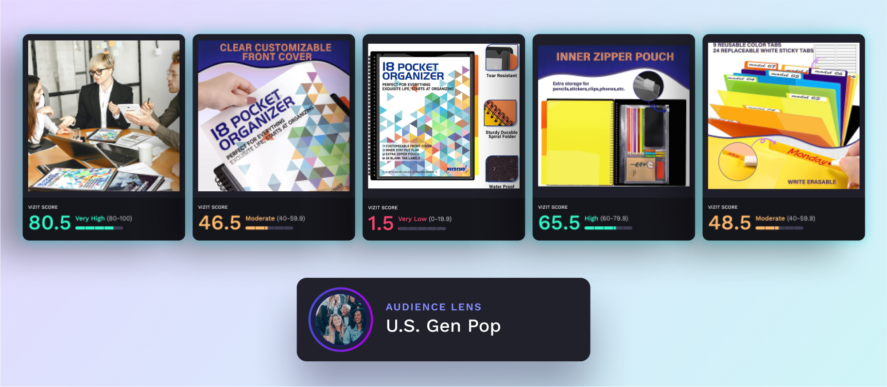 Sooez’s average carousel score is 61.8. The top carousel images featured a minimalist and clean design, with minimal design highlighting features of the pocket folder. Moderate scoring images lost ground with a busier design, including several images within one frame. The lowest scoring image has five smaller scenes within one image.