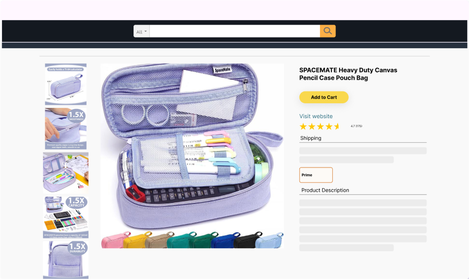 Vizit's latest Brand Attention Index thoroughly analyzes hero and carousel imagery trends in Amazon's leading school supply listings. One standout example of a top-performing product detail page (PDP) in this category is the Spacemate Heavy Duty Canvas Pencil Case Pouch.