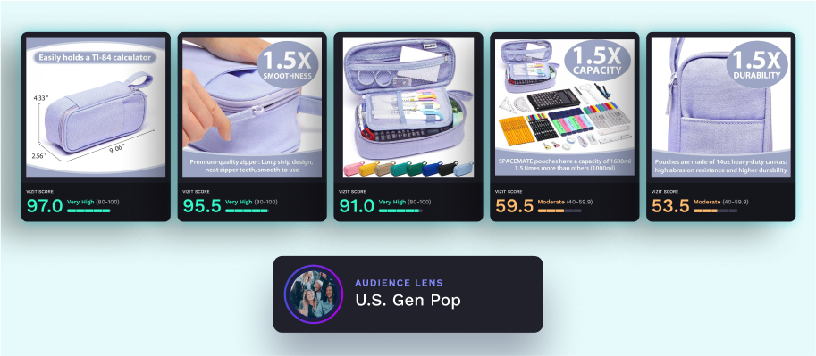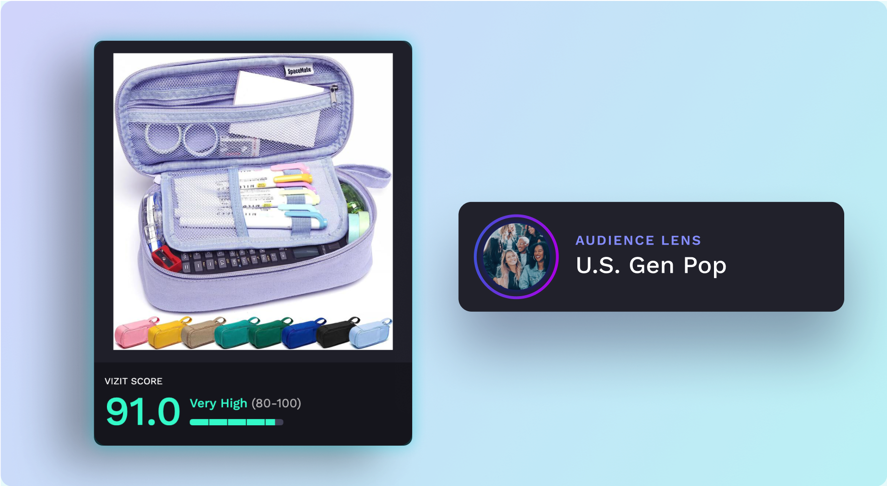 The Spacemate canvas pouch hero image earned a Vizit score of 91.0, firmly placing it in the category's top 10 highest scoring hero images when using a U.S. Gen Pop audience lens.