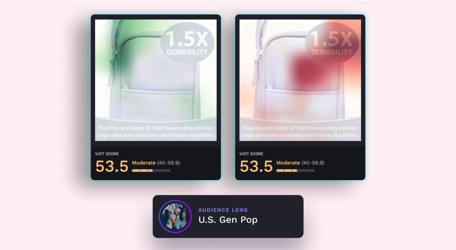 The lowest scoring carousel image earned a moderate Vizit score of 53.5. Audience insight maps illustrate how simple modifications can optimize the image for the U.S. Gen Pop audience. Engagement and opportunity maps indicate that moving the text bubble from the top right of the image to the top left will garner higher engagement with the chosen audience lens.