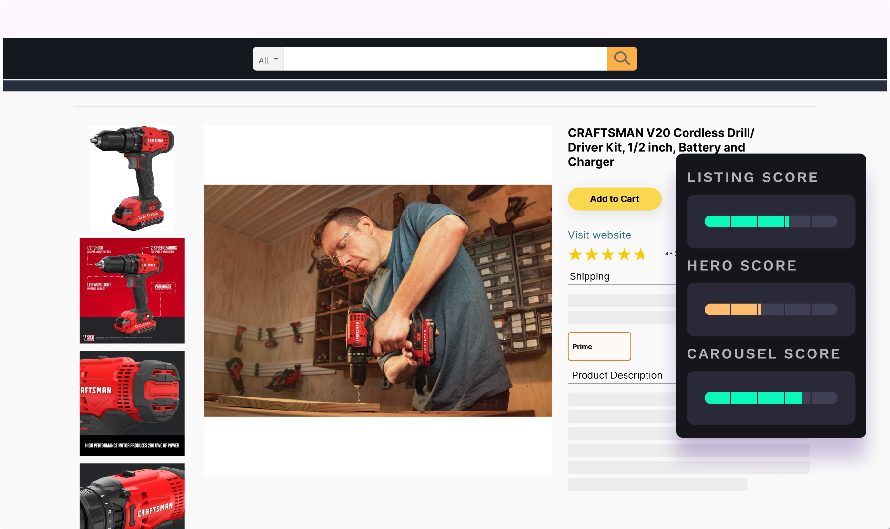 As part of our Power Tools Content Effectiveness Rankings report, we analyzed image trends and best practices of power drill listings on Amazon. Based on the results, we decided to provide creative updates to a low-scoring carousel image on the CRAFTSMAN V20 Cordless Drill/Driver Kit using Vizit’s predictive analytics and image insights.