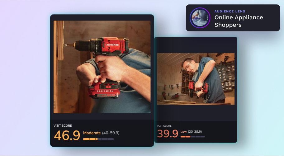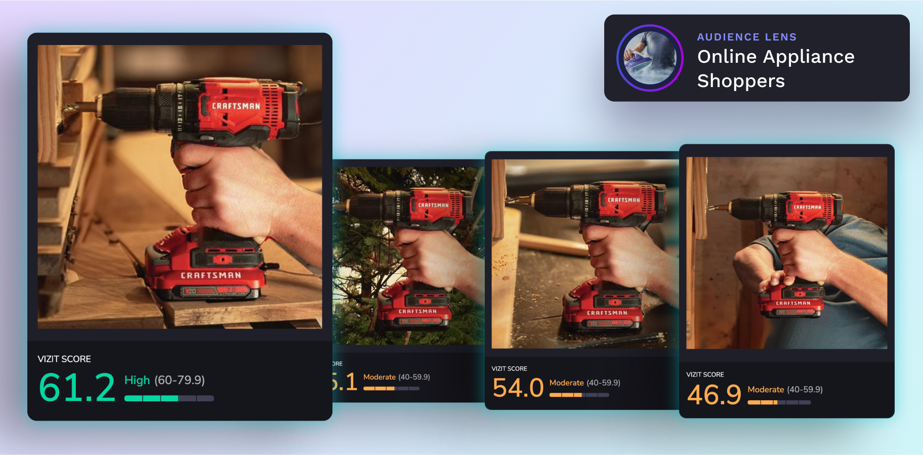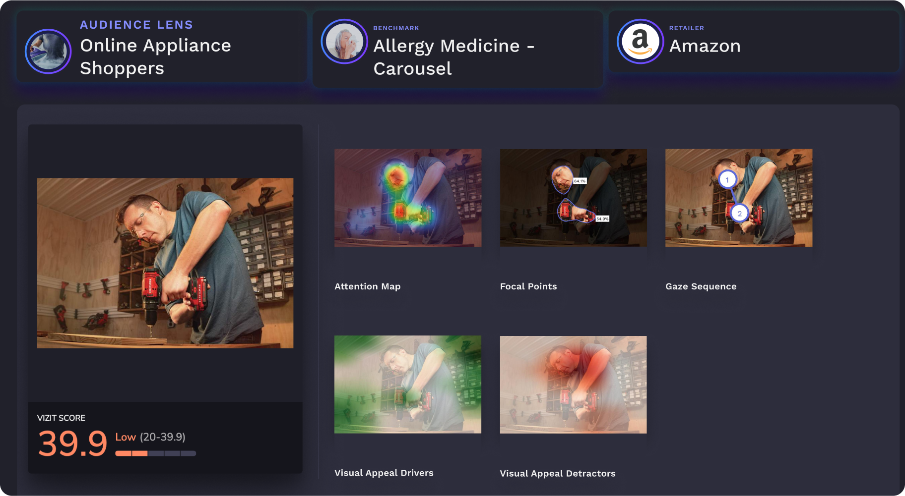 Our initial analysis of the CRAFTSMAN carousel image shows it is underperforming among online appliance shoppers, with a low Vizit Score of 39.9. Attention visualization maps reveal that viewers focus mainly on the model and the power tool. However, further analysis using visual appeal and detractor maps indicates that although the model attracts attention, its position in the image reduces its overall visual appeal. In contrast, the background and the power tool are more appealing to the target audience.