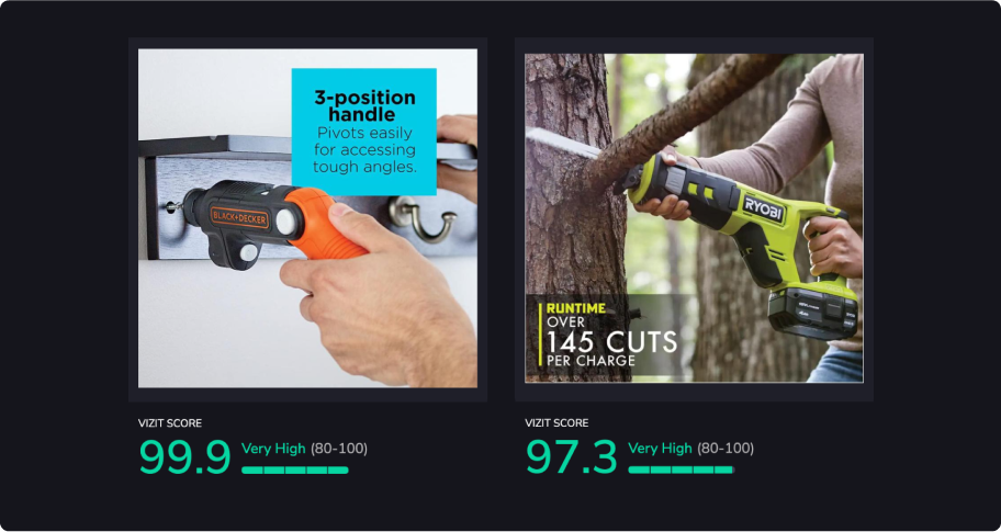 Our Power Tools Content Effectiveness Rankings report identified two main trends in lifestyle carousel visuals for this category. First, close-up images of hands holding power tools, particularly with the hand entering from the right side, were very effective with our target audience. Second, visuals featuring outdoor or workshop backgrounds also performed well.