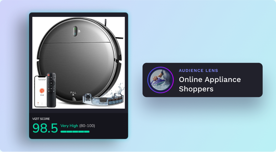 The MAMNV vacuum cleaner hero image earned a very high Vizit Score of 98.5, placing it as the category's second highest scoring hero image when using an Online Appliance Shoppers Audience Lens.