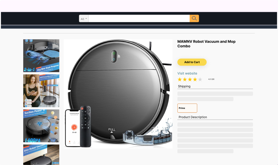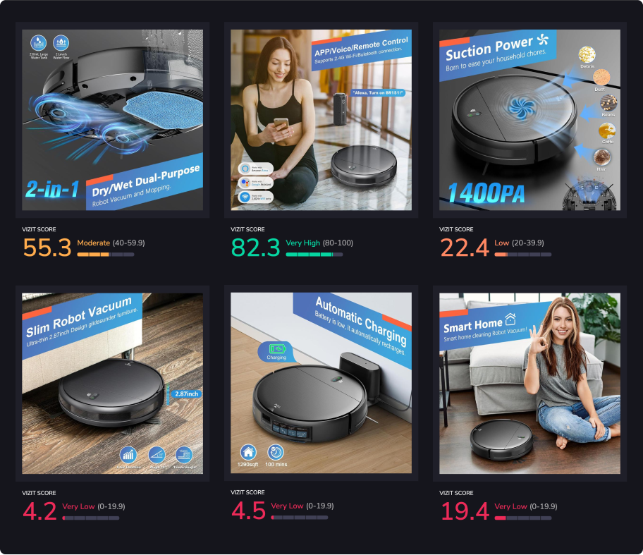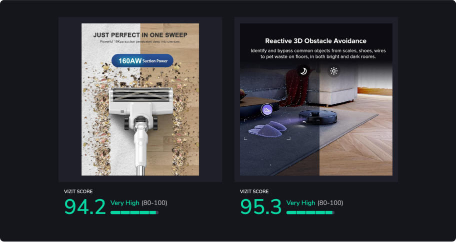 Vizit's recent Content Analysis Report thoroughly analyzes hero and carousel imagery trends in Amazon's leading vacuum cleaner listings. One standout example of a top-performing product detail page (PDP) in this category is the MAMNV Robot Vacuum and Mop Combo.