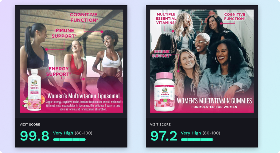 Top scoring carousel images among women’s vitamin brands included many depictions of active, healthy women of all ages. Promotional copy in these carousel images is simple and benefits-focused.