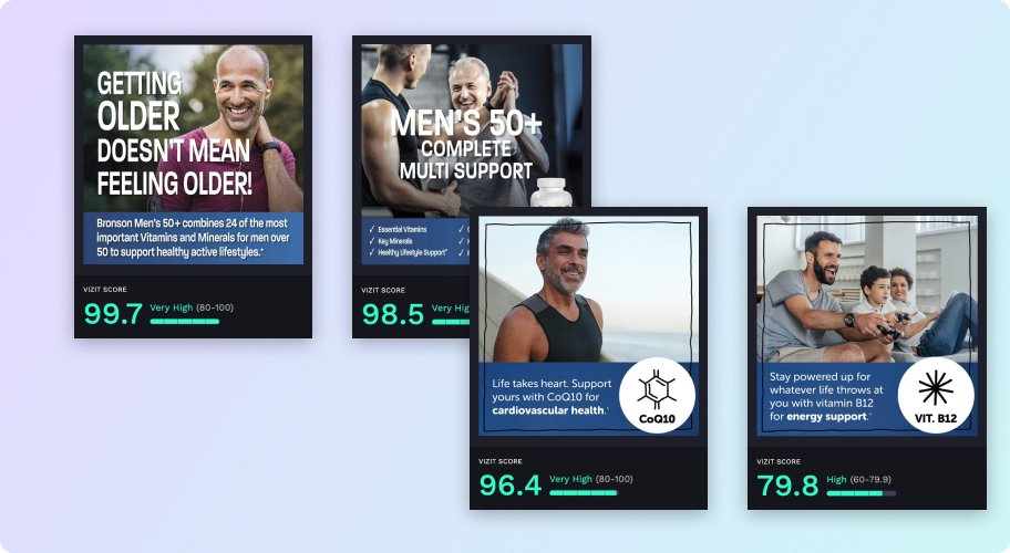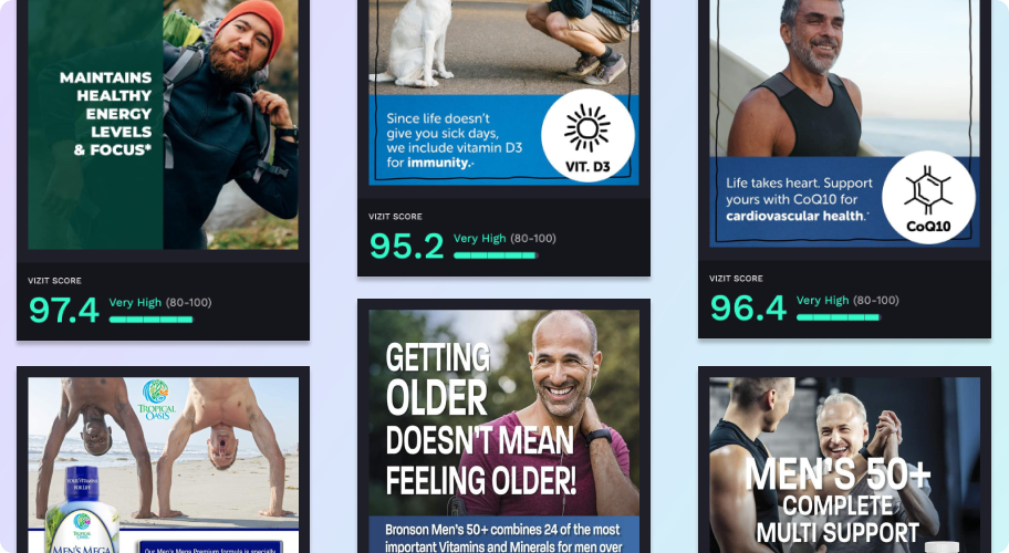 Like the women’s category, many of the highest scoring men’s vitamin carousel images featured men of all ages engaging in a variety of activities. Some of these visuals emphasized active lifestyles—complete with portrayals of men happily enjoying cardio workouts, surfing, and hiking. Other high-scoring images showed aspirational pictures of a different kind, with men enjoying time with their families and dogs.