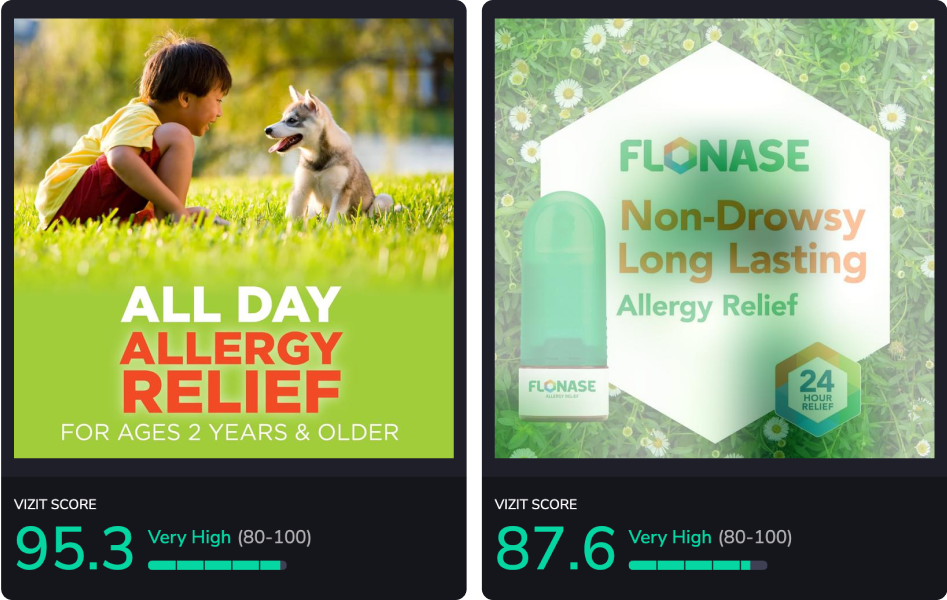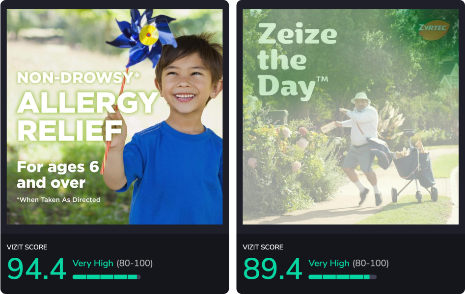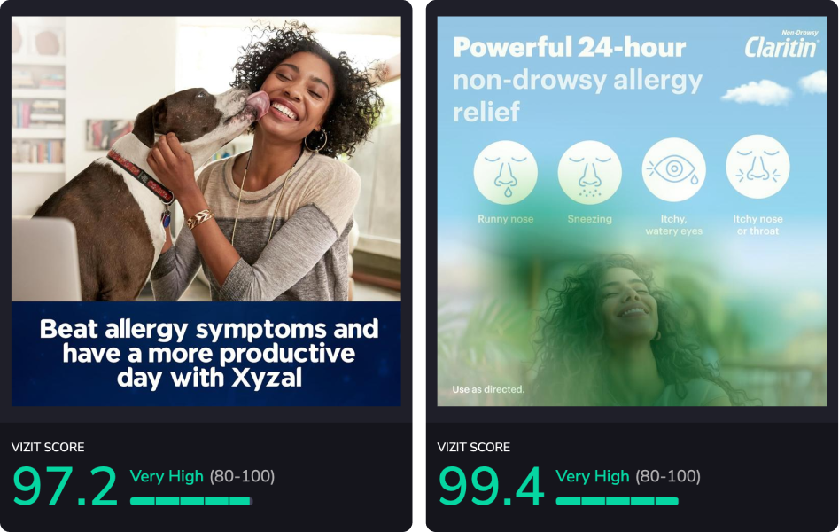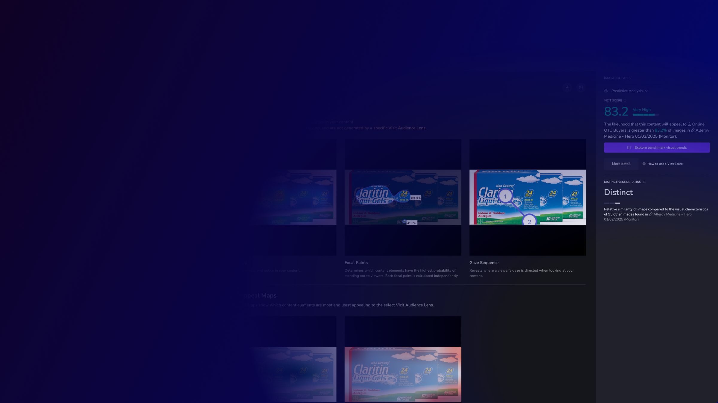 AI-powered visual appeal insights reveal specific aspects of imagery that are appealing and unappealing to a selected audience, while attention insights simulate human eye tracking and indicate where attention is likely to be garnered and how the average consumer is likely to view the elements within an image. Along with Vizit Scores, these insights are leveraged to prioritize changes that increase an image’s overall effectiveness with the intended audience.