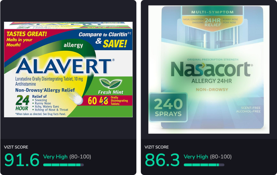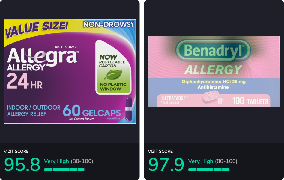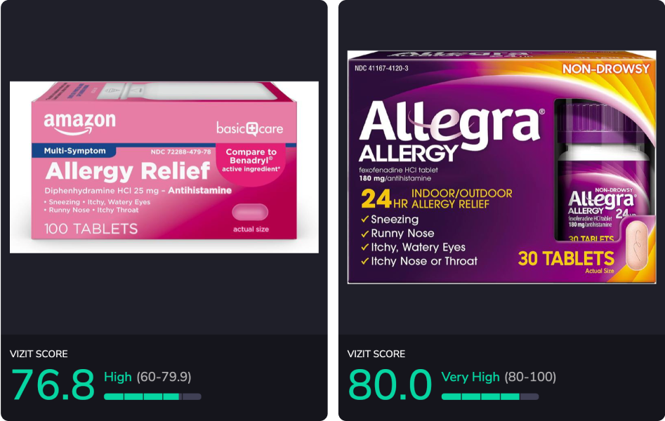 Vizit scores visual content for effectiveness with consumer audiences. Each image receives a score from 0-100 that predicts its level of effectiveness with the specified audience. Product detail page (PDP) or listing-level scores are driven by an aggregate score of the product hero or primary imagery, carousel or secondary imagery, volume of content, and sequencing of content. Content Effectiveness Rankings scores may aggregate several brand PDPs depending on retailer search and best seller lists, which fluctuate often. Higher-scoring images and PDPs are more effective and appealing to online shopper audiences.