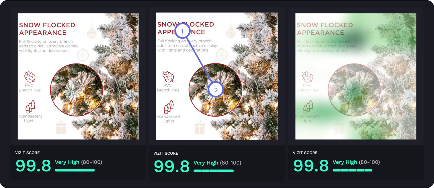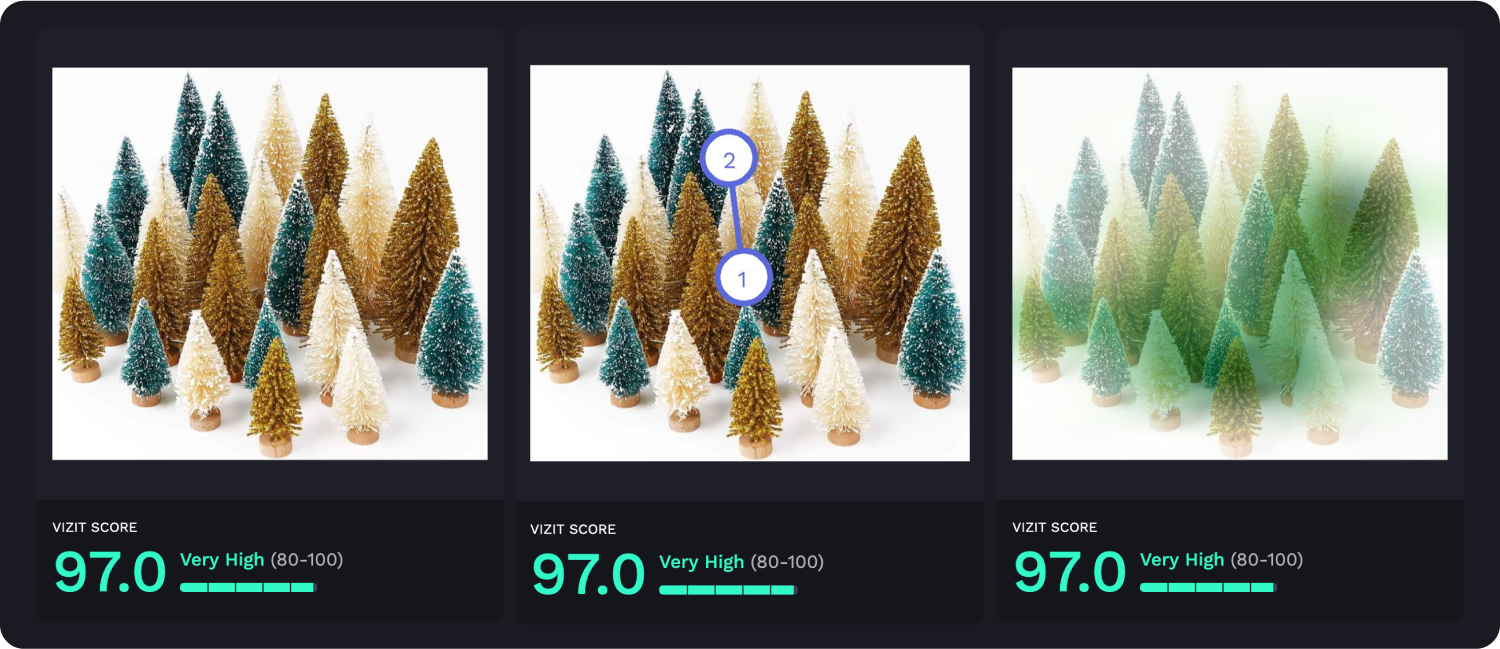 AI-powered visual appeal insights reveal specific aspects of imagery that are appealing and unappealing to a selected audience, while attention insights simulate human eye tracking and indicate where attention is likely to be garnered and how the average consumer is likely to view the elements within an image. Along with Vizit Scores, these insights are leveraged to prioritize changes that increase an image’s overall effectiveness with the intended audience.