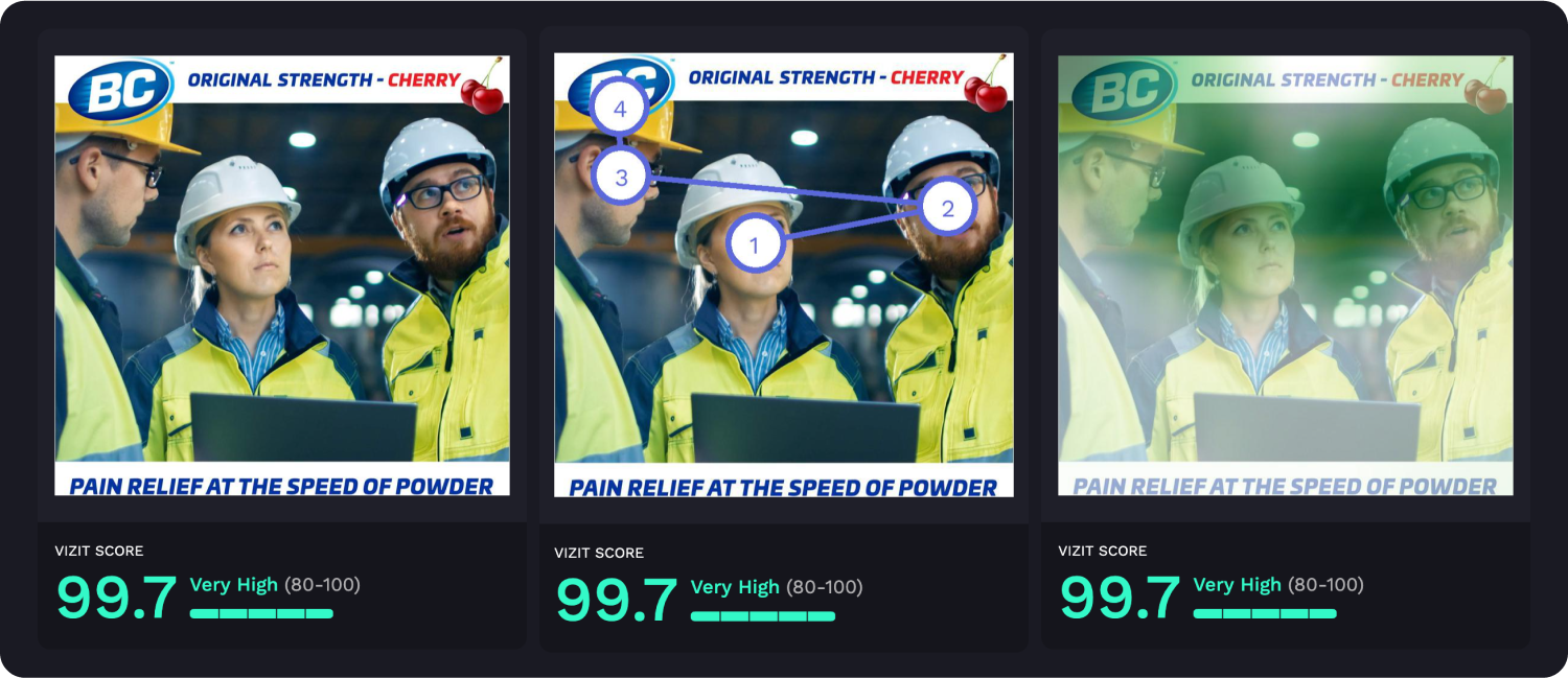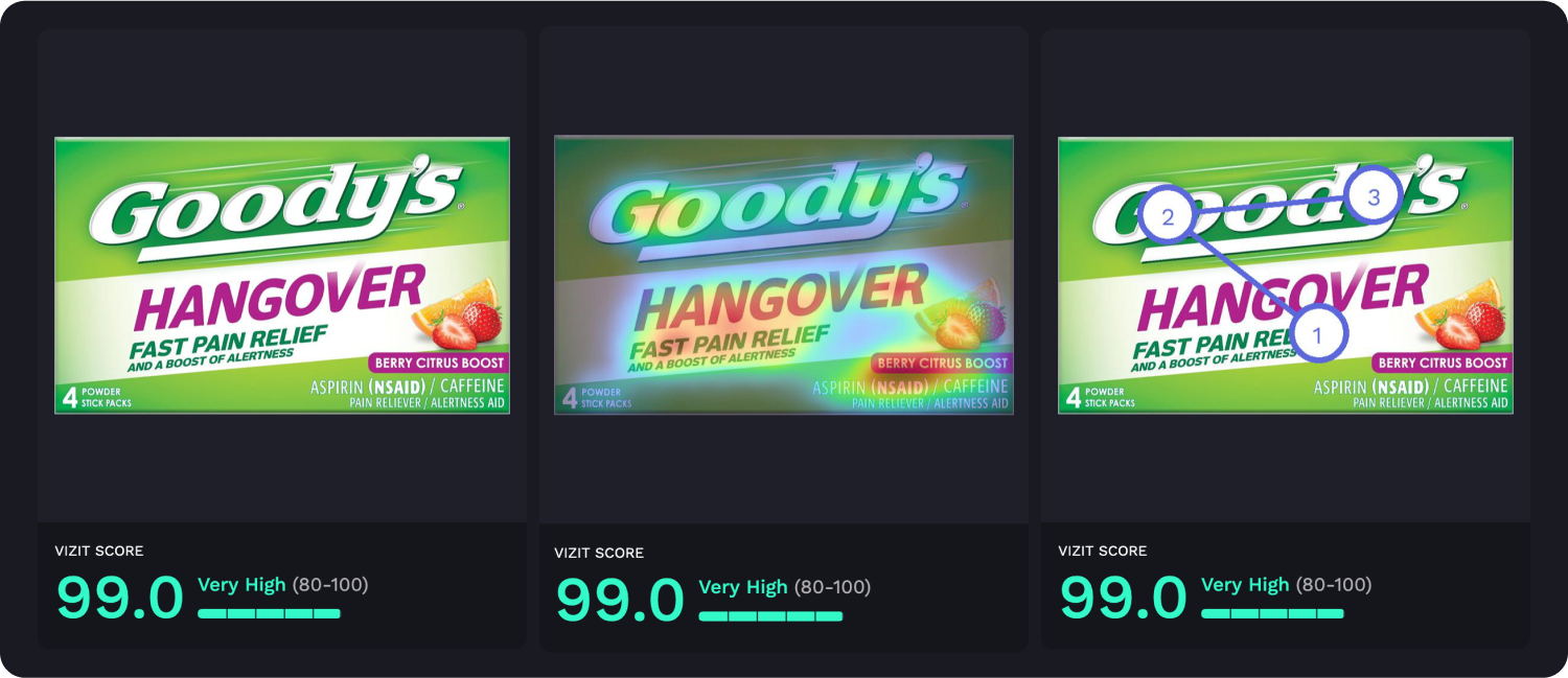 AI-powered visual appeal insights reveal specific aspects of imagery that are appealing and unappealing to a selected audience, while attention insights simulate human eye tracking and indicate where attention is likely to be garnered and how the average consumer is likely to view the elements within an image. Along with Vizit Scores, these insights are leveraged to prioritize changes that increase an image’s overall effectiveness with the intended audience.