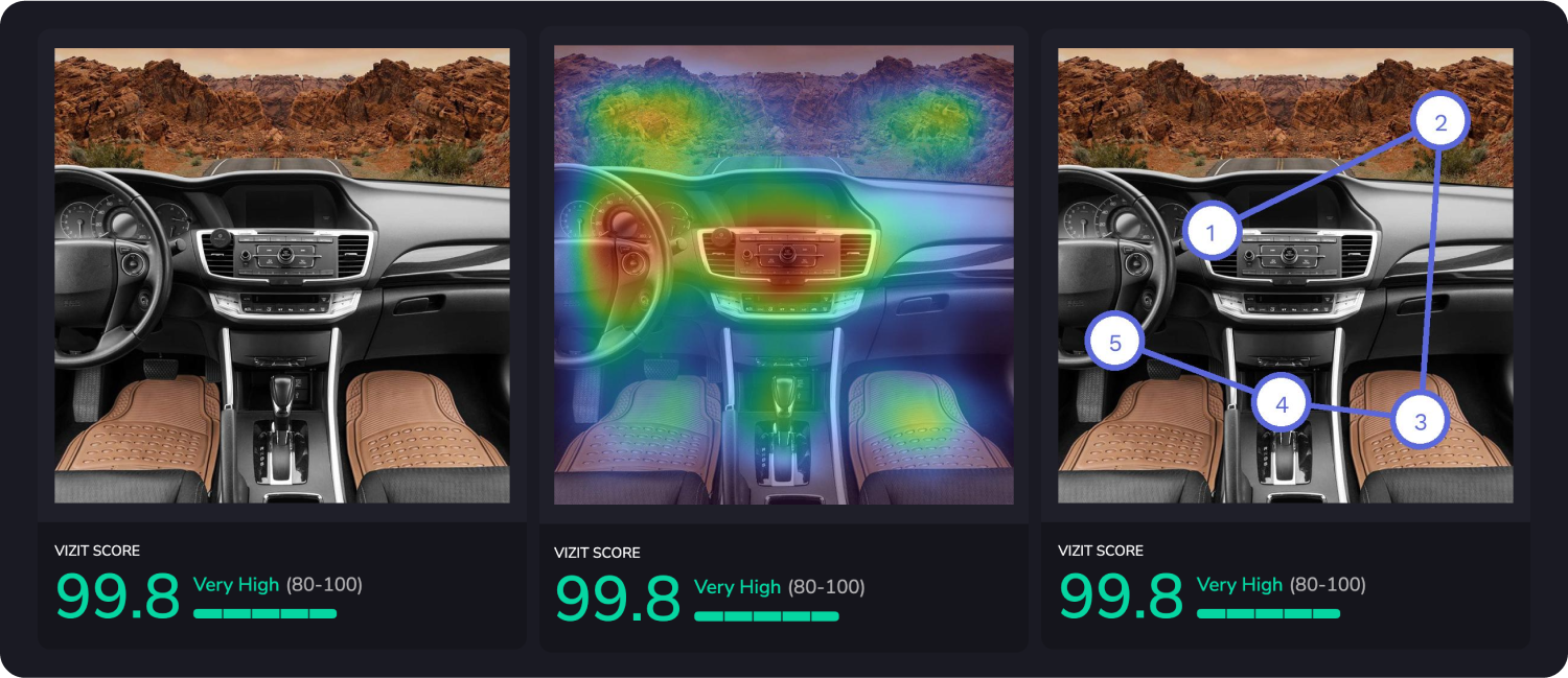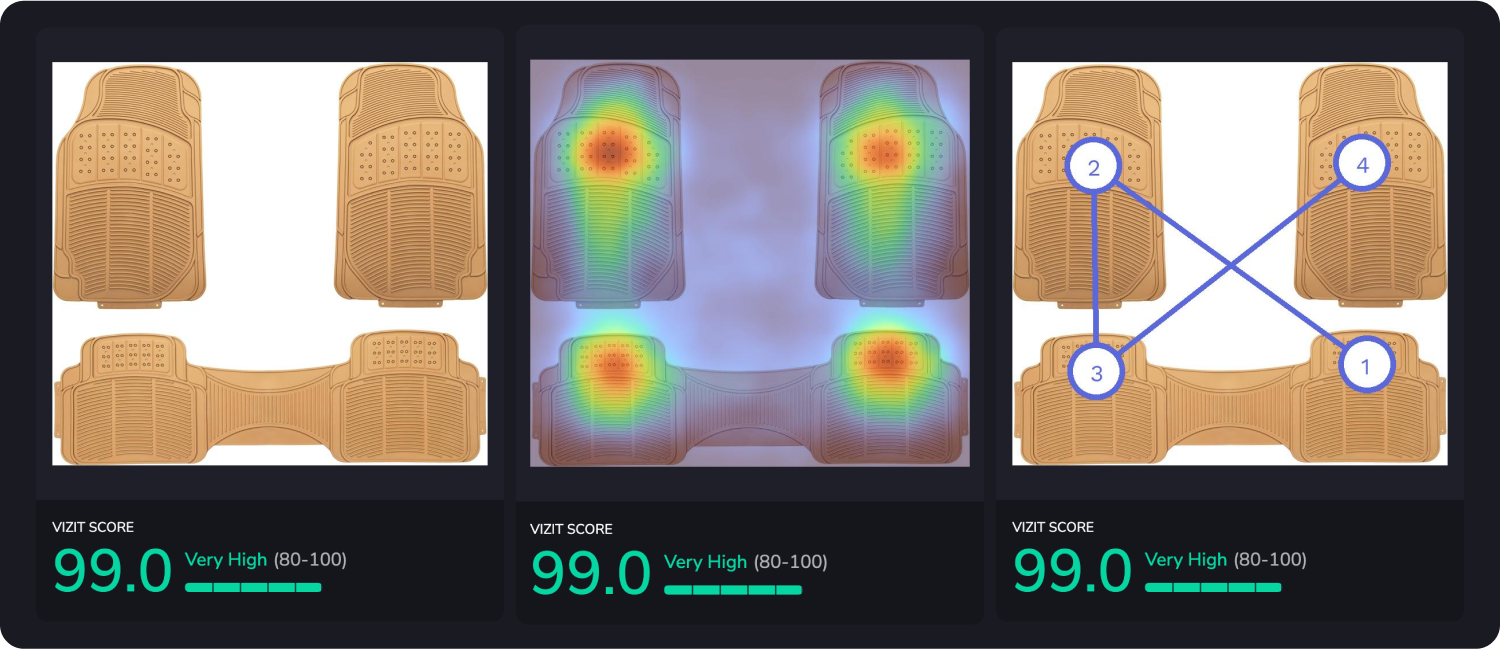 AI-powered visual appeal insights reveal specific aspects of imagery that are appealing and unappealing to a selected audience, while attention insights simulate human eye tracking and indicate where attention is likely to be garnered and how the average consumer is likely to view the elements within an image. Along with Vizit Scores, these insights are leveraged to prioritize changes that increase an image’s overall effectiveness with the intended audience.