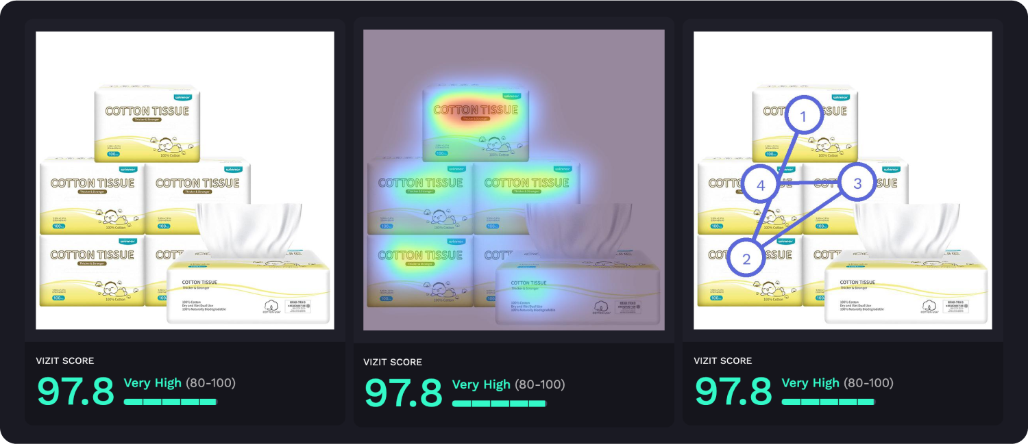 AI-powered visual appeal insights reveal specific aspects of imagery that are appealing and unappealing to a selected audience, while attention insights simulate human eye tracking and indicate where attention is likely to be garnered and how the average consumer is likely to view the elements within an image. Along with Vizit Scores, these insights are leveraged to prioritize changes that increase an image’s overall effectiveness with the intended audience.