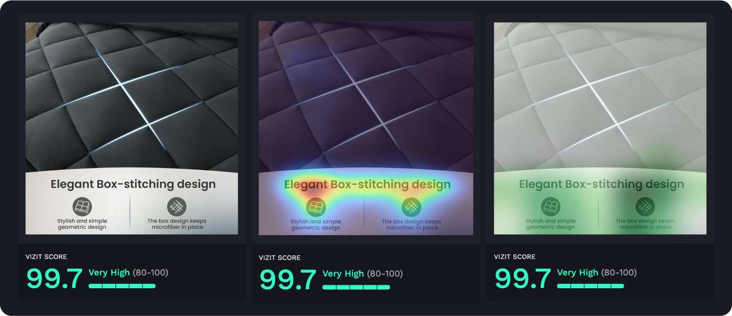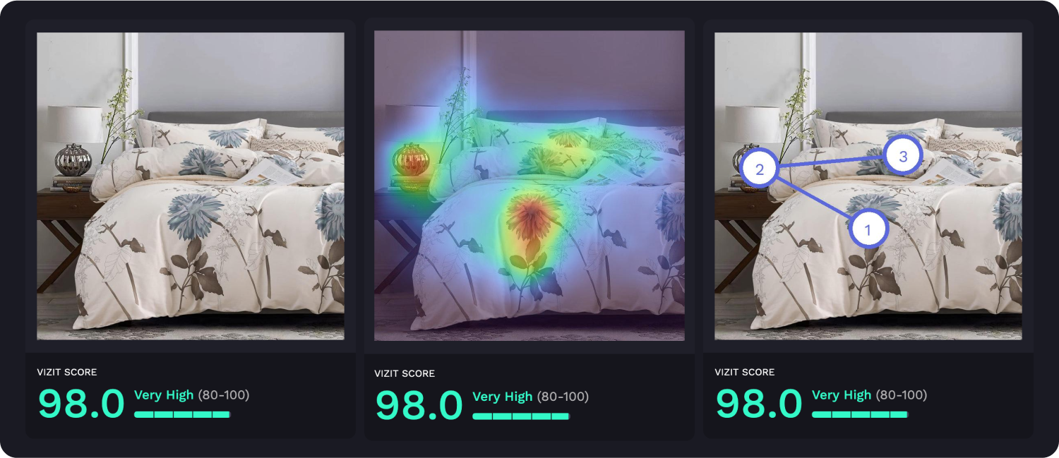 AI-powered visual appeal insights reveal specific aspects of imagery that are appealing and unappealing to a selected audience, while attention insights simulate human eye tracking and indicate where attention is likely to be garnered and how the average consumer is likely to view the elements within an image. Along with Vizit Scores, these insights are leveraged to prioritize changes that increase an image’s overall effectiveness with the intended audience.