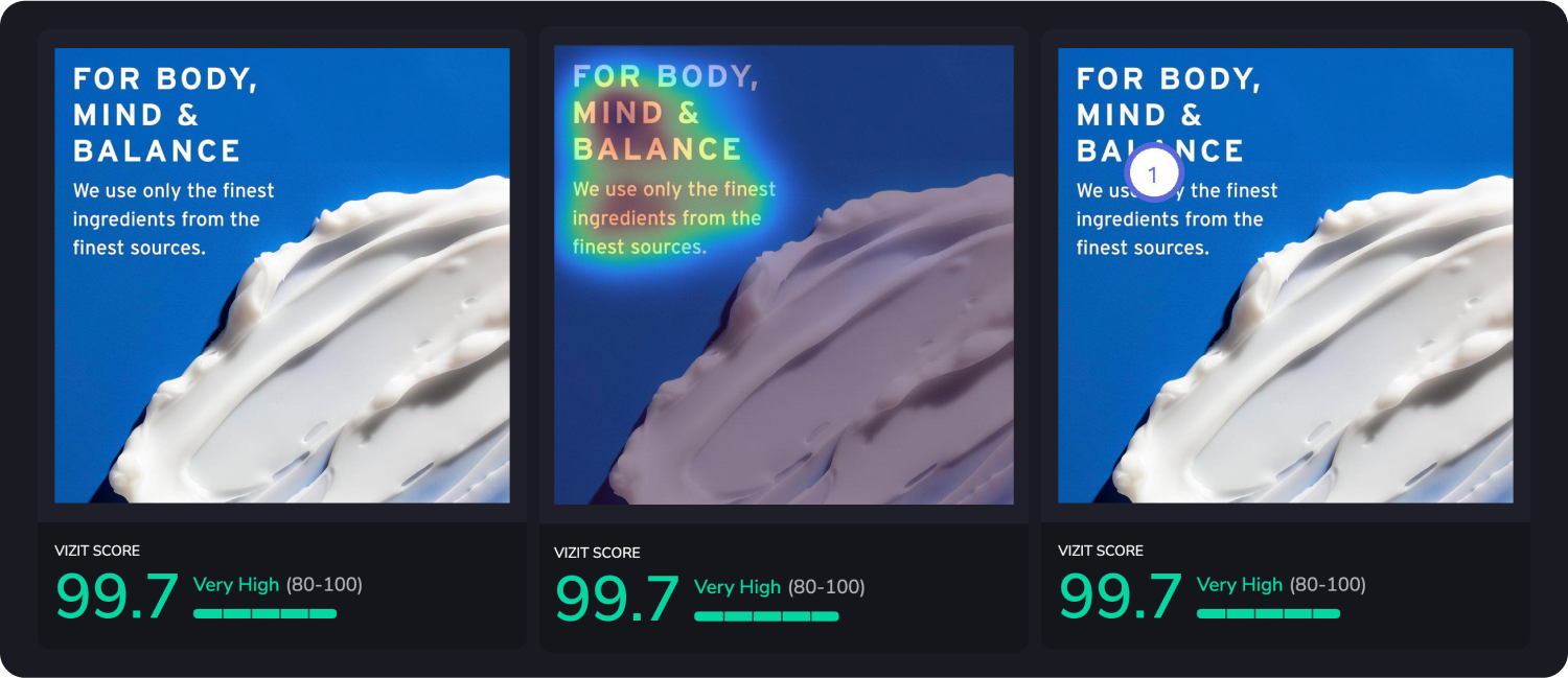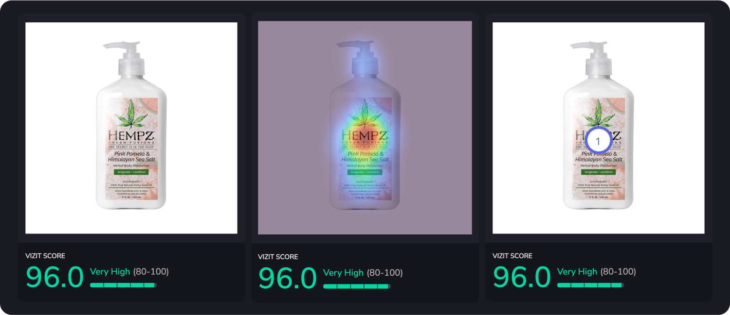 AI-powered visual appeal insights reveal specific aspects of imagery that are appealing and unappealing to a selected audience, while attention insights simulate human eye tracking and indicate where attention is likely to be garnered and how the average consumer is likely to view the elements within an image. Along with Vizit Scores, these insights are leveraged to prioritize changes that increase an image’s overall effectiveness with the intended audience.