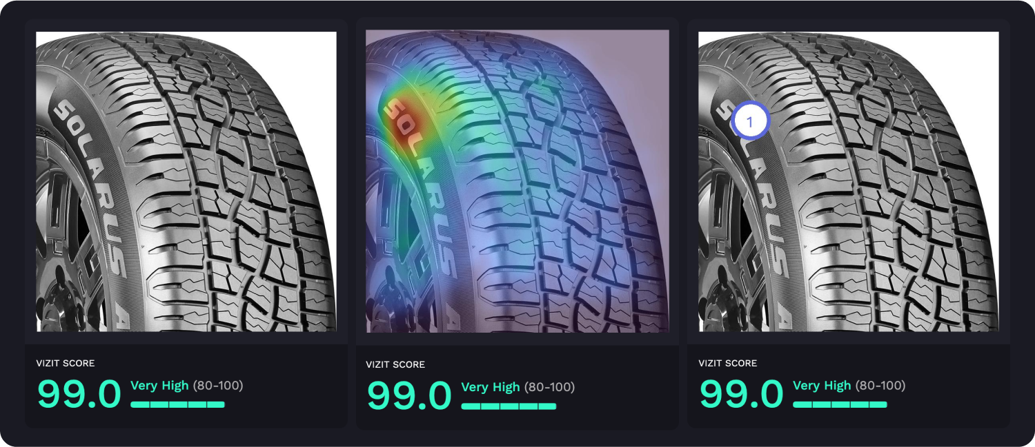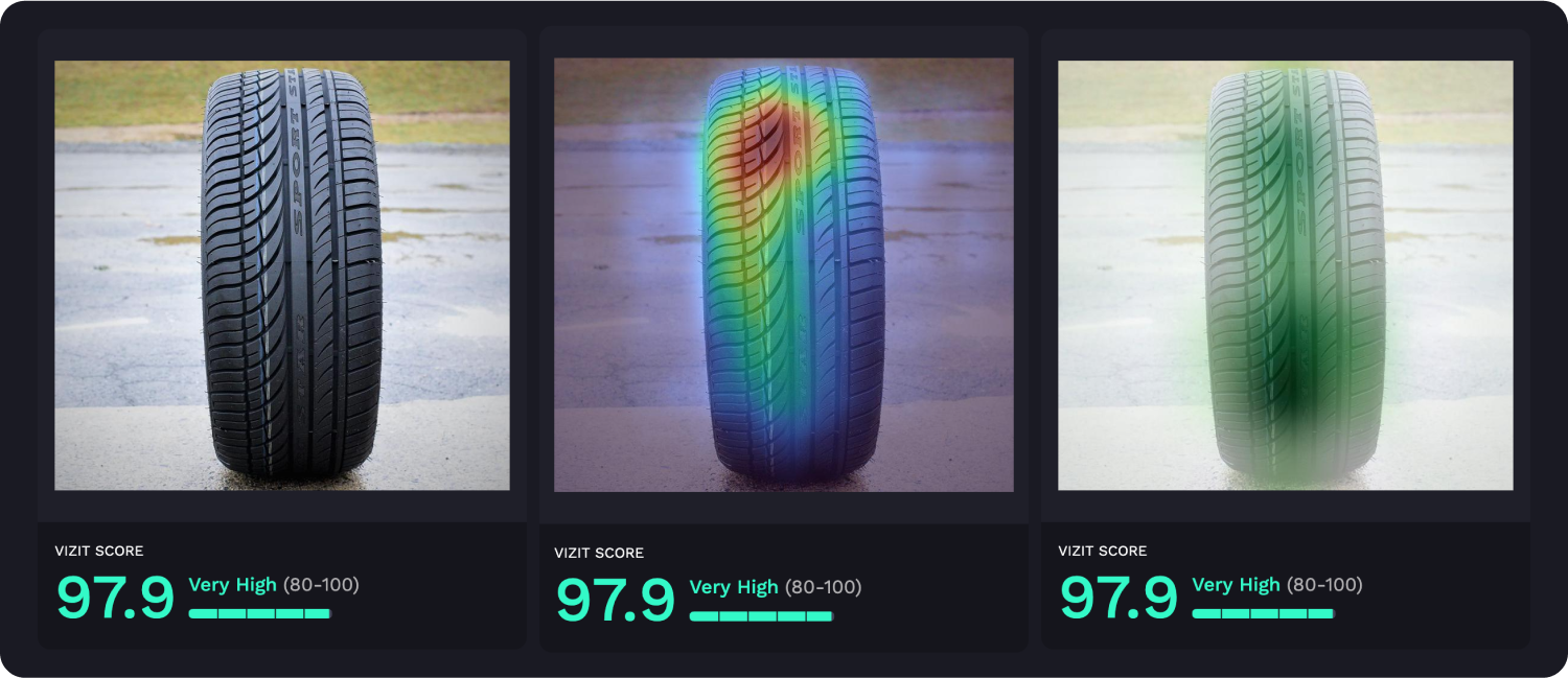 AI-powered visual appeal insights reveal specific aspects of imagery that are appealing and unappealing to a selected audience, while attention insights simulate human eye tracking and indicate where attention is likely to be garnered and how the average consumer is likely to view the elements within an image. Along with Vizit Scores, these insights are leveraged to prioritize changes that increase an image’s overall effectiveness with the intended audience.
