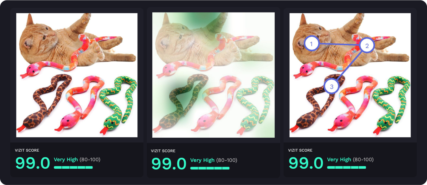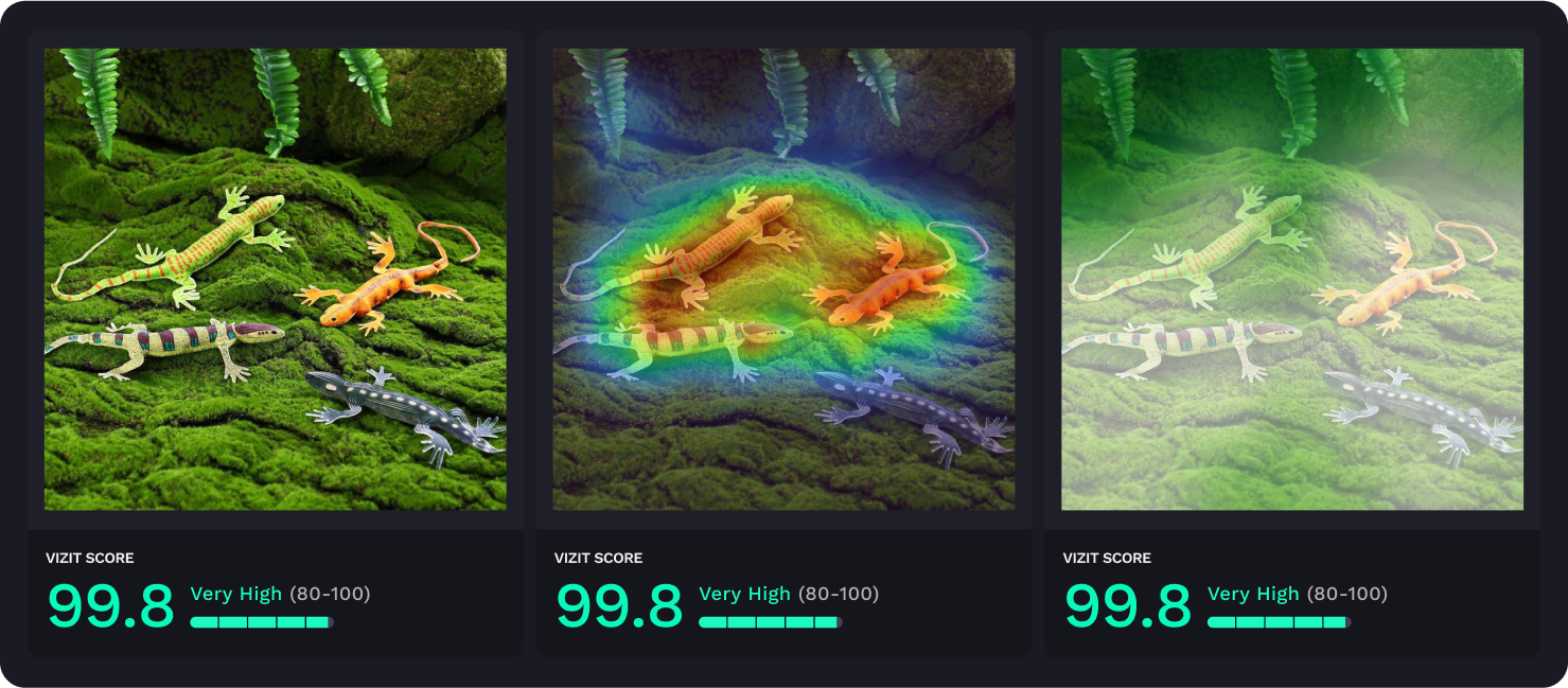 AI-powered visual appeal insights reveal specific aspects of imagery that are appealing and unappealing to a selected audience, while attention insights simulate human eye tracking and indicate where attention is likely to be garnered and how the average consumer is likely to view the elements within an image. Along with Vizit Scores, these insights are leveraged to prioritize changes that increase an image’s overall effectiveness with the intended audience.