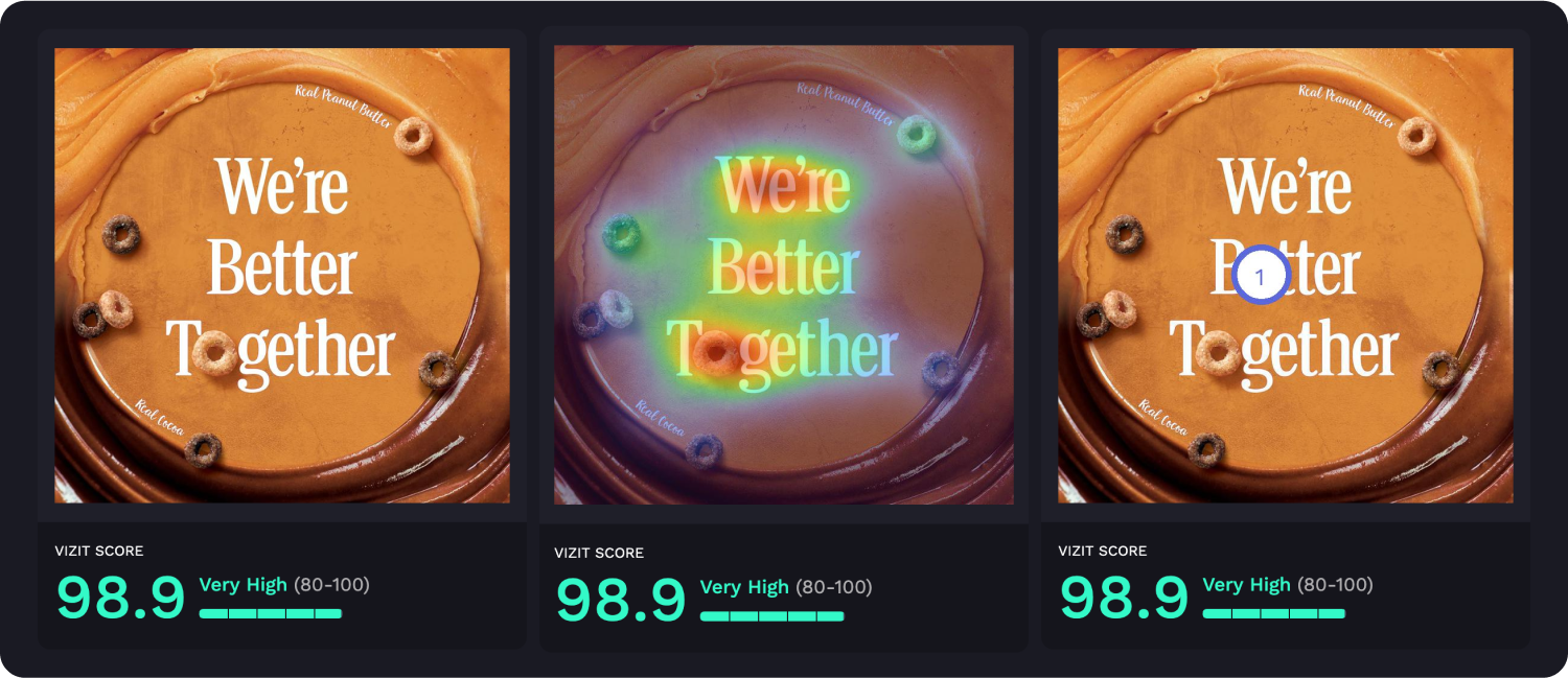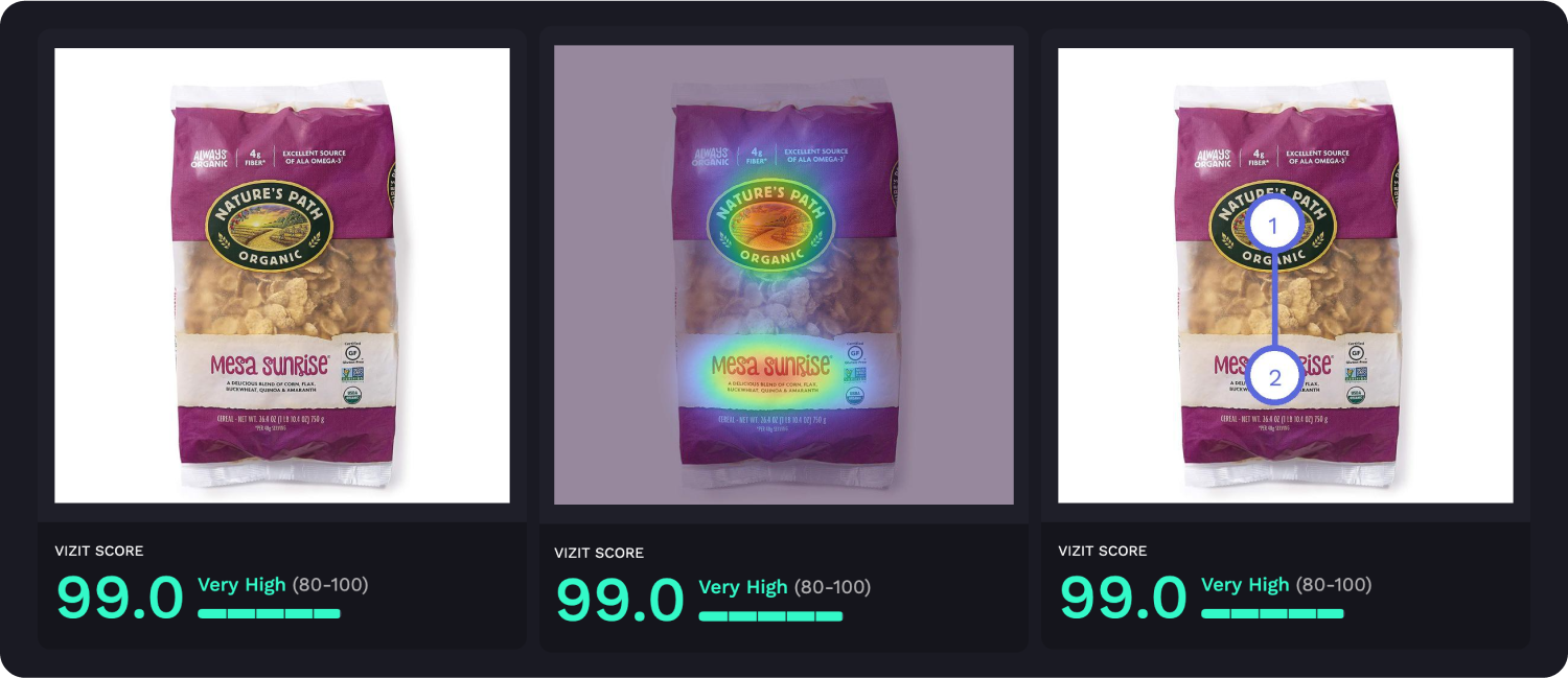 AI-powered visual appeal insights reveal specific aspects of imagery that are appealing and unappealing to a selected audience, while attention insights simulate human eye tracking and indicate where attention is likely to be garnered and how the average consumer is likely to view the elements within an image. Along with Vizit Scores, these insights are leveraged to prioritize changes that increase an image’s overall effectiveness with the intended audience.