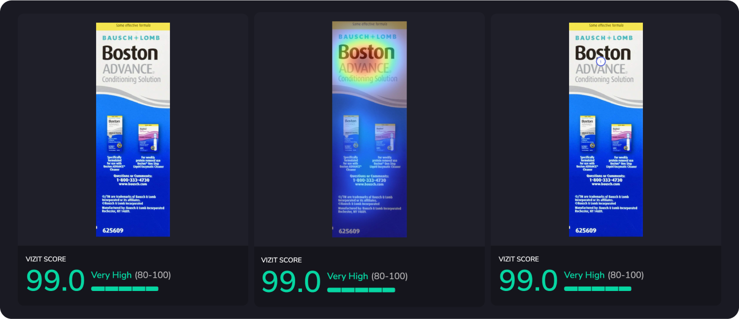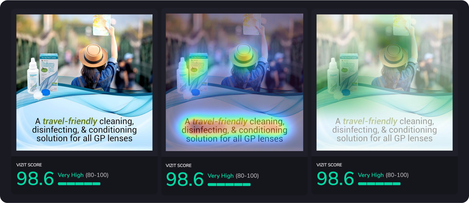 AI-powered visual appeal insights reveal specific aspects of imagery that are appealing and unappealing to a selected audience, while attention insights simulate human eye tracking and indicate where attention is likely to be garnered and how the average consumer is likely to view the elements within an image. Along with Vizit Scores, these insights are leveraged to prioritize changes that increase an image’s overall effectiveness with the intended audience.