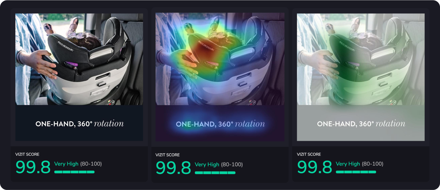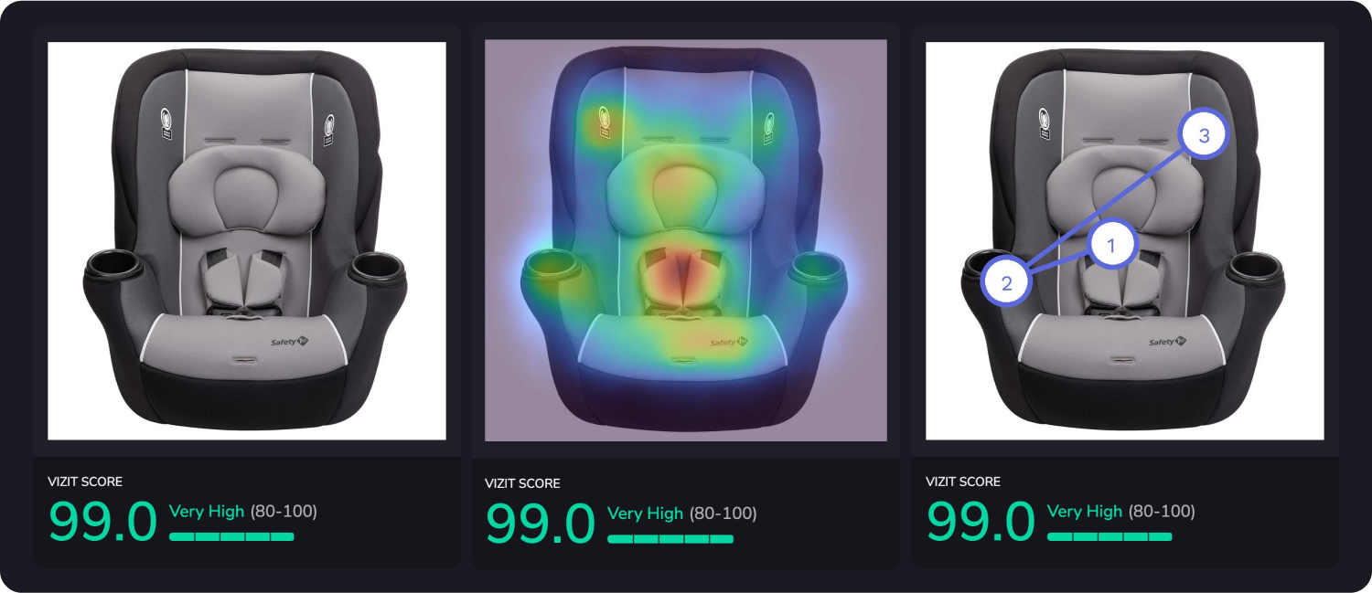 AI-powered visual appeal insights reveal specific aspects of imagery that are appealing and unappealing to a selected audience, while attention insights simulate human eye tracking and indicate where attention is likely to be garnered and how the average consumer is likely to view the elements within an image. Along with Vizit Scores, these insights are leveraged to prioritize changes that increase an image’s overall effectiveness with the intended audience.