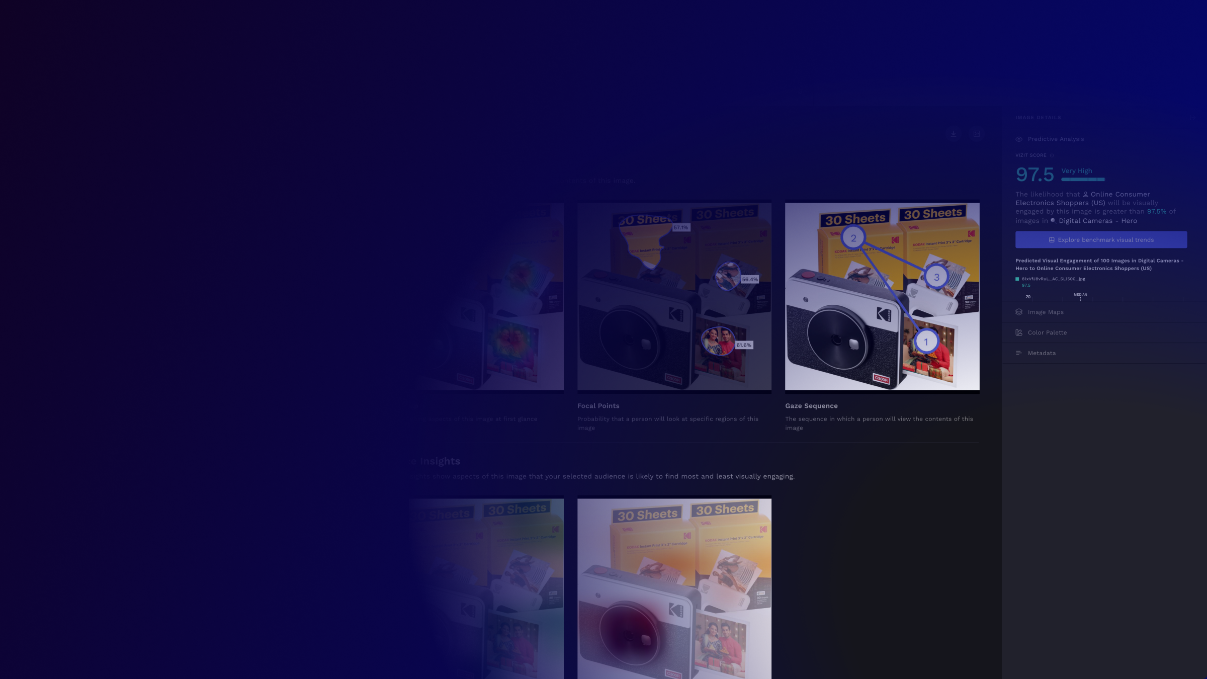 AI-powered visual appeal insights reveal specific aspects of imagery that are appealing and unappealing to a selected audience, while attention insights simulate human eye tracking and indicate where attention is likely to be garnered and how the average consumer is likely to view the elements within an image. Along with Vizit Scores, these insights are leveraged to prioritize changes that increase an image’s overall effectiveness with the intended audience.