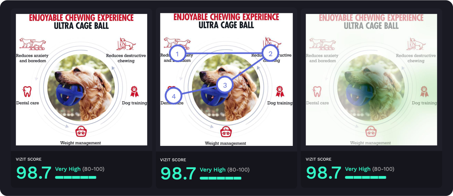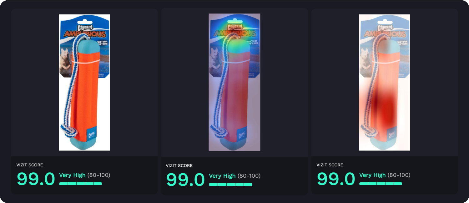 AI-powered visual appeal insights reveal specific aspects of imagery that are appealing and unappealing to a selected audience, while attention insights simulate human eye tracking and indicate where attention is likely to be garnered and how the average consumer is likely to view the elements within an image. Along with Vizit Scores, these insights are leveraged to prioritize changes that increase an image’s overall effectiveness with the intended audience.