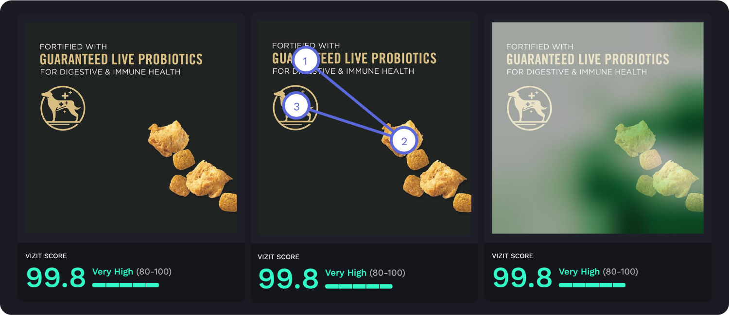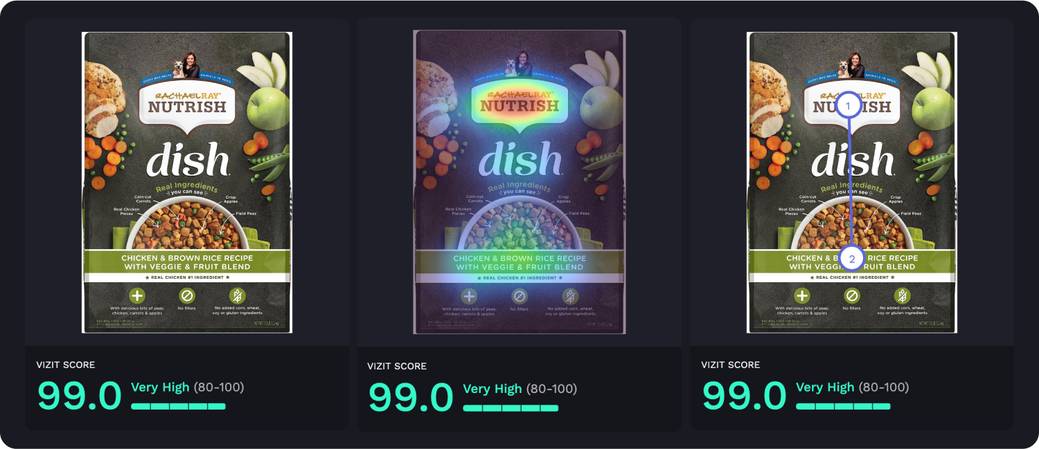 AI-powered visual appeal insights reveal specific aspects of imagery that are appealing and unappealing to a selected audience, while attention insights simulate human eye tracking and indicate where attention is likely to be garnered and how the average consumer is likely to view the elements within an image. Along with Vizit Scores, these insights are leveraged to prioritize changes that increase an image’s overall effectiveness with the intended audience.
