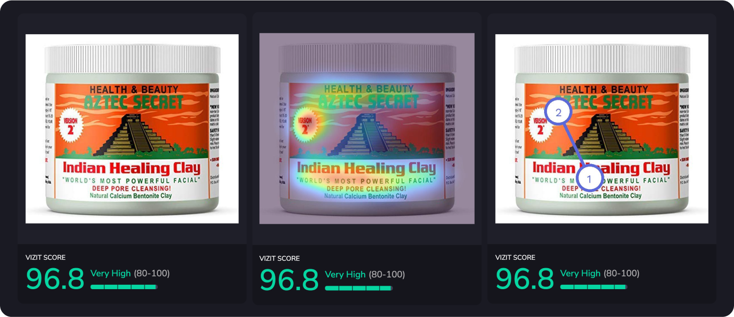 AI-powered visual appeal insights reveal specific aspects of imagery that are appealing and unappealing to a selected audience, while attention insights simulate human eye tracking and indicate where attention is likely to be garnered and how the average consumer is likely to view the elements within an image. Along with Vizit Scores, these insights are leveraged to prioritize changes that increase an image’s overall effectiveness with the intended audience.