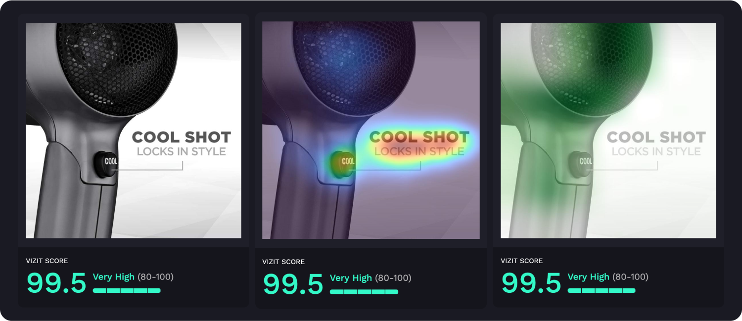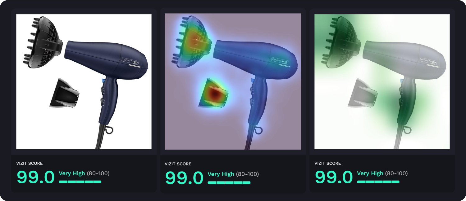 AI-powered visual appeal insights reveal specific aspects of imagery that are appealing and unappealing to a selected audience, while attention insights simulate human eye tracking and indicate where attention is likely to be garnered and how the average consumer is likely to view the elements within an image. Along with Vizit Scores, these insights are leveraged to prioritize changes that increase an image’s overall effectiveness with the intended audience.
